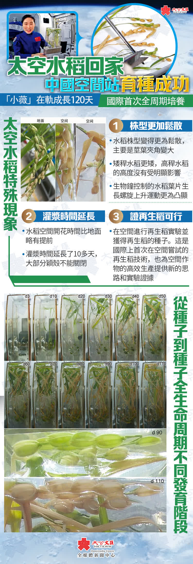 (大公報 記者 劉凝哲)隨着神舟十四號飛船返回艙順利降落東風着陸場,備受網友關注的明星太空植物「小南」(擬南芥)、「小薇」(水稻)也回家了!經歷了在軌120天全生命周期的水稻和擬南芥種子,目前已隨同其他載人空間科學實驗樣品交付空間應用系統,後續將轉運至上海實驗室做進一步檢測分析。這是國際上首次在軌開展水稻從種子到種子全生命周期培養實驗。科學家在空間站進行的再生稻實驗初步發現,在空間狹小的封閉環境中再生稻是可行的,為空間作物的高效生產提供了新的思路和實驗證據。