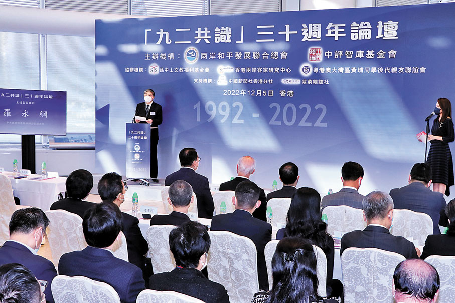 (香港文匯報記者 康敬)兩岸和平發展聯合總會與中評智庫基金會昨日在港舉辦「九二共識」30周年論壇。是次論壇主要回顧了「九二共識」的歷史經緯,與會嘉賓強調「九二共識」是堅持一個中國原則、堅決反對「台獨」的共識,亦希望深化「九二共識」,早日化解兩岸長期存在的政治爭議,在「九二共識」的基礎上推動兩岸關係和平發展,促進兩岸更多交流合作,以及兩岸同胞的民生發展和安全保障。