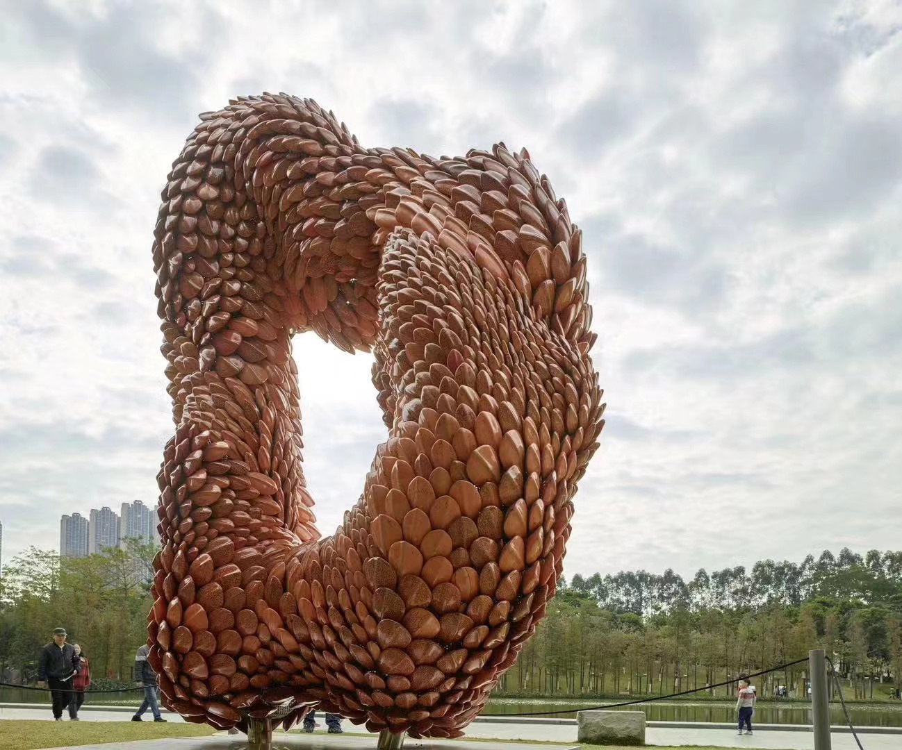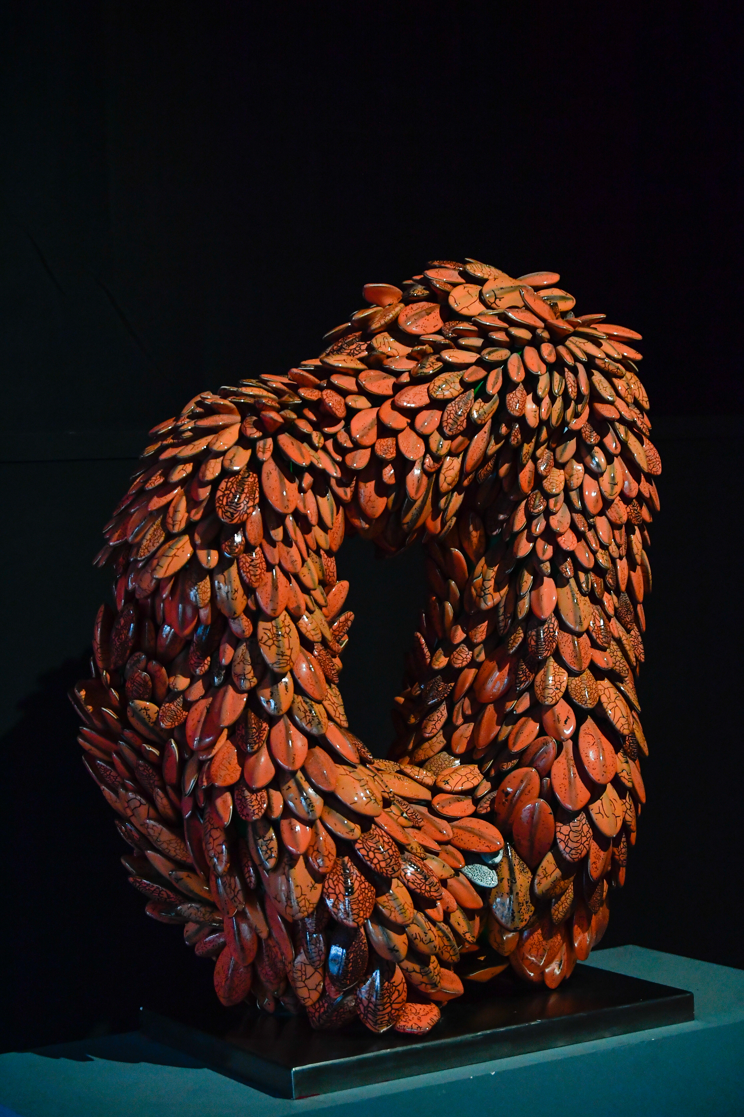 郅敏表示,傳統文化的精華還需要創造性的轉化,需要與當代的表達相配合。以單體元素結合序列化拚接嵌入的形式,在《二十四節氣》系列雕塑中得到更進一步的探索。陶瓷的小片單體類似羽毛、鱗片、亦或是果實,卵子,細胞,是「眾有之本,萬象之根」,是「一生二,二生三,三生萬物」的本源,是無窮無盡的可能。小片單體一個個附着在特定的巨大形體之上,是向自然生命的多樣性進化致敬,是對自然萬物宏大生命力的禮讚。