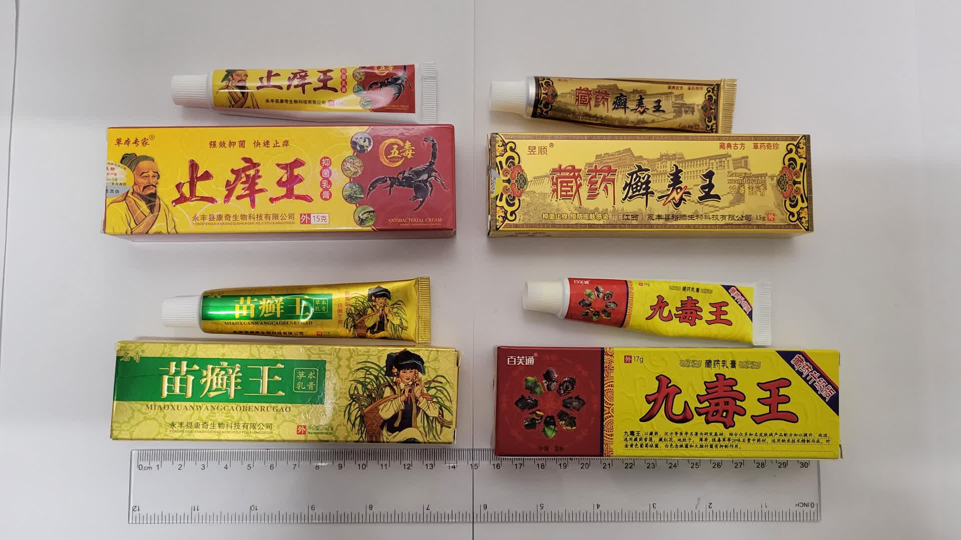 大公文匯全媒體報道,衞生署呼籲市民切勿購買或使用四款含有未標示受管制藥物成分的外用產品,有關產品分別是「草本专家止痒王抑菌乳膏」、「名奇苗癣王草本乳膏」、「昱順藏药癣毒王草本乳膏」及「百芙通九毒王藏药乳膏」。