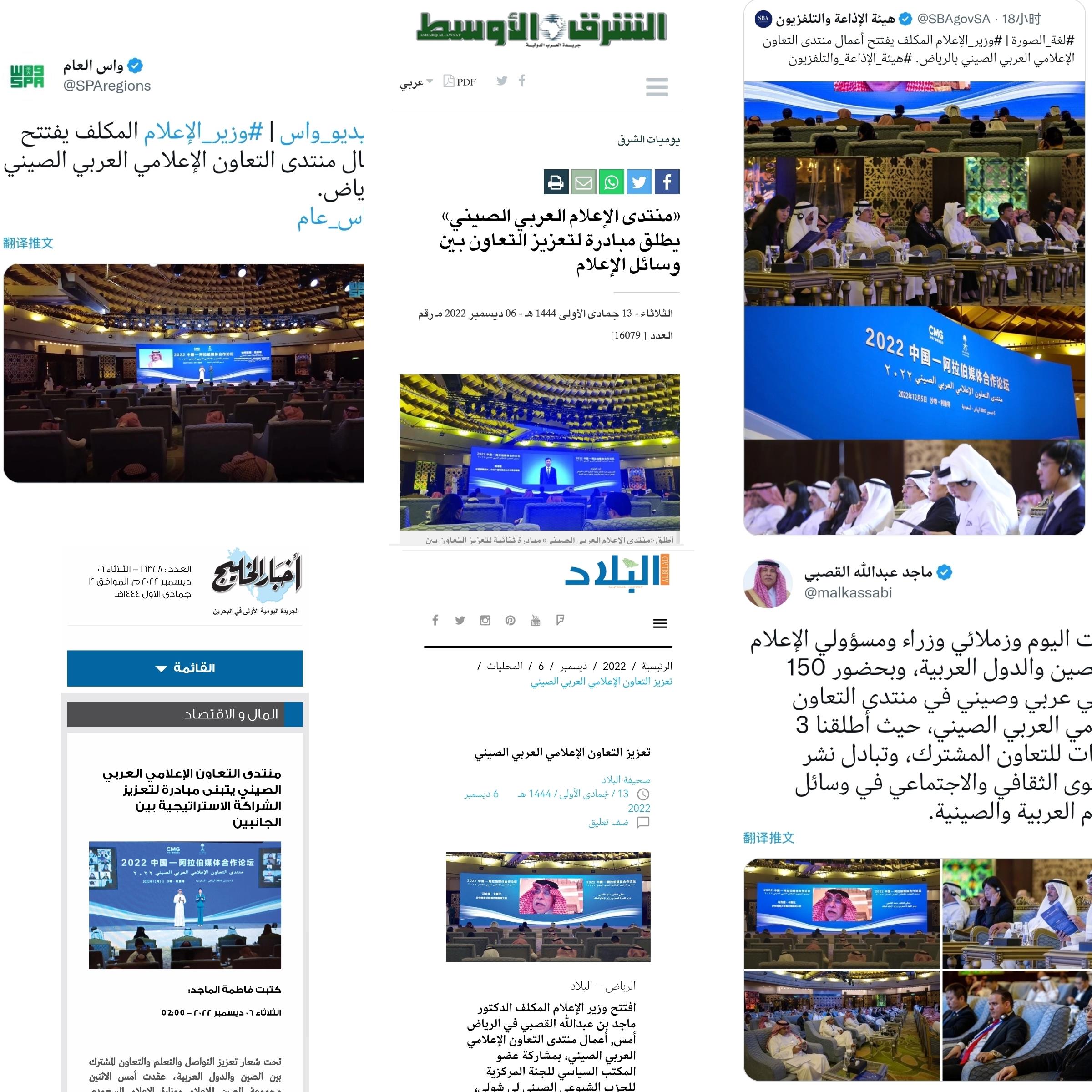 2022中國—阿拉伯媒體合作論壇獲得阿拉伯國家多家主流媒體廣泛關注。沙特國家電視台、沙特國家通訊社,沙特《中東報》《歐卡茲報》《國家報》、埃及《金字塔報》、科威特《祖國報》、巴林《海灣消息報》等30餘家阿拉伯國家主流媒體對論壇進行了直播和報道。