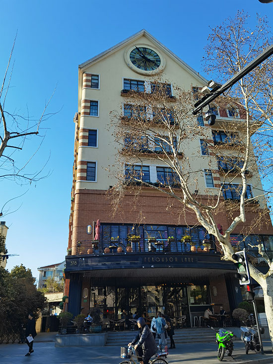 當然,在修復過程中不乏有所寓新的續筆。幸福咖啡店所在這幢8層建築,原來為房地賓館。設計團隊在保留外牆色彩基調的同時,修改了原來的窗戶,並在接近樓頂處添加了巨大的時鐘牆面。如今,只要步行至武康路泰安路口抬頭仰望,時空穿越感便撲面而來,這也成為武康路的一大標誌。