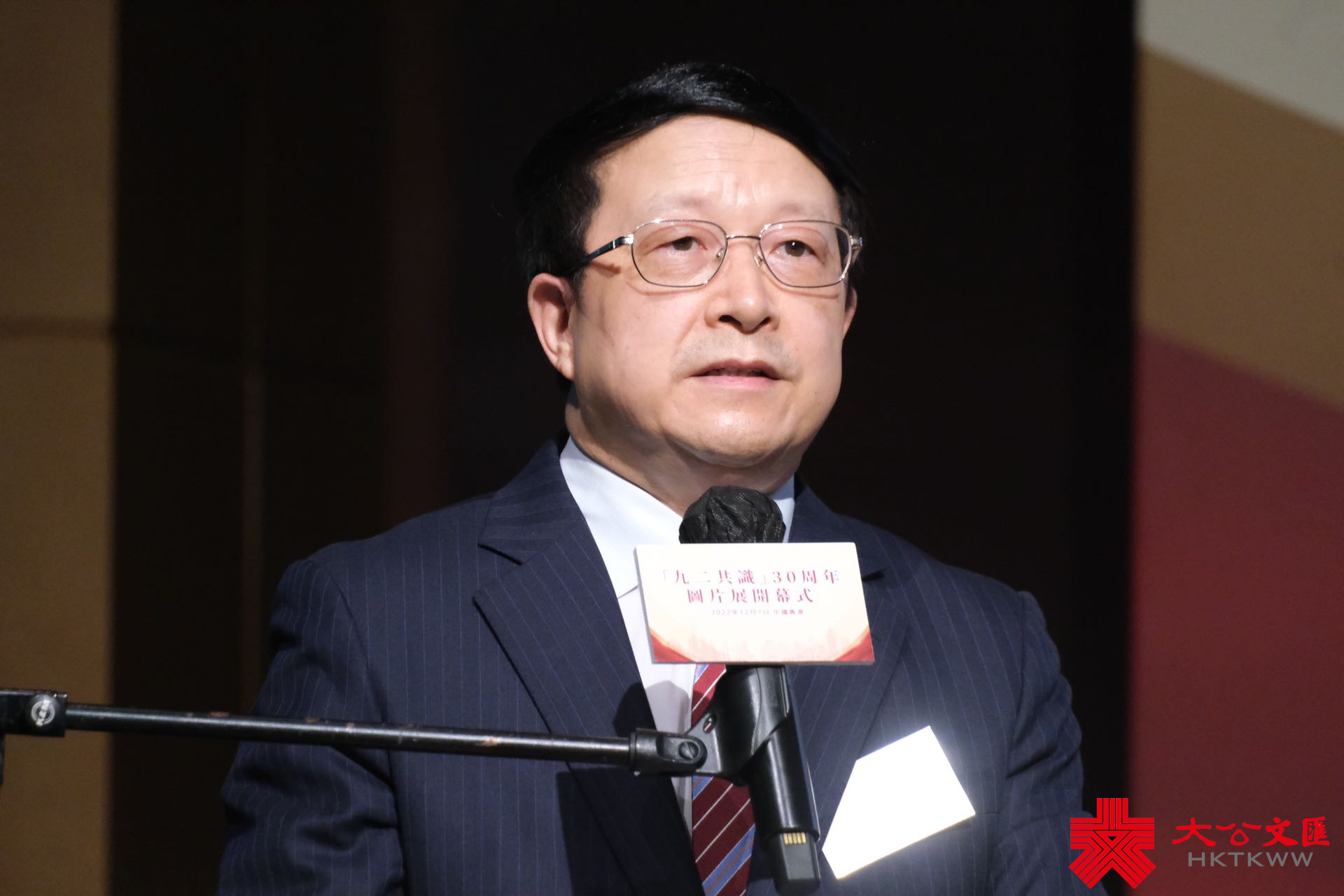 大公文匯全媒體報道,今年是「九二共識」30周年,也是香港回歸祖國25周年。香港大公文匯傳媒集團和中國和平統一促進會香港總會於今日(7日)下午在香港會議展覽中心聯合舉辦「九二共識」30周年圖片展開幕式。籌委會主席、香港大公文匯傳媒集團董事長、總編輯兼香港文匯報社社長、大公報社社長李大宏在致辭時表示,「一國兩制」在香港成功實踐,對台灣有重要的啟示作用。多年來,香港在推動兩岸民間交流、推動兩岸關係和平發展方面起着重要的作用。大公文匯傳媒集團將與香港各界人士一道繼續團結廣大台灣同胞,堅定支持島內愛國統一力量,共同把握歷史大勢,堅守民族大義,為反「獨」促統、為中華民族偉大復興做出新貢獻!