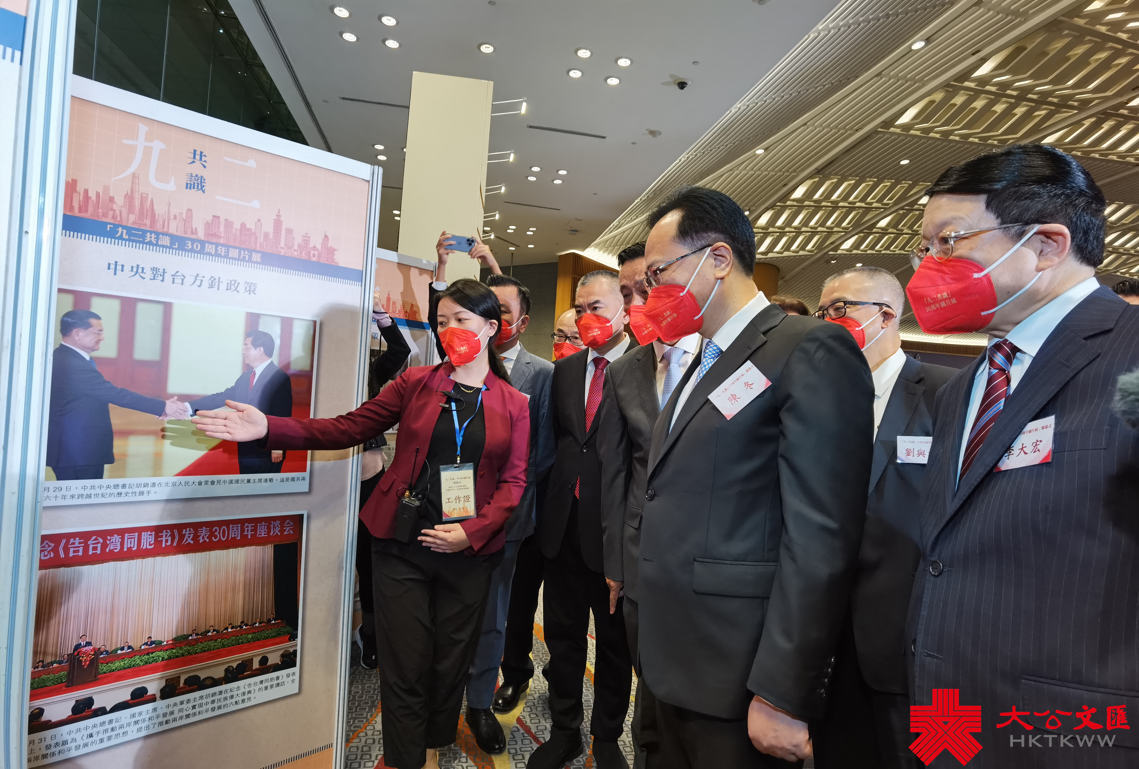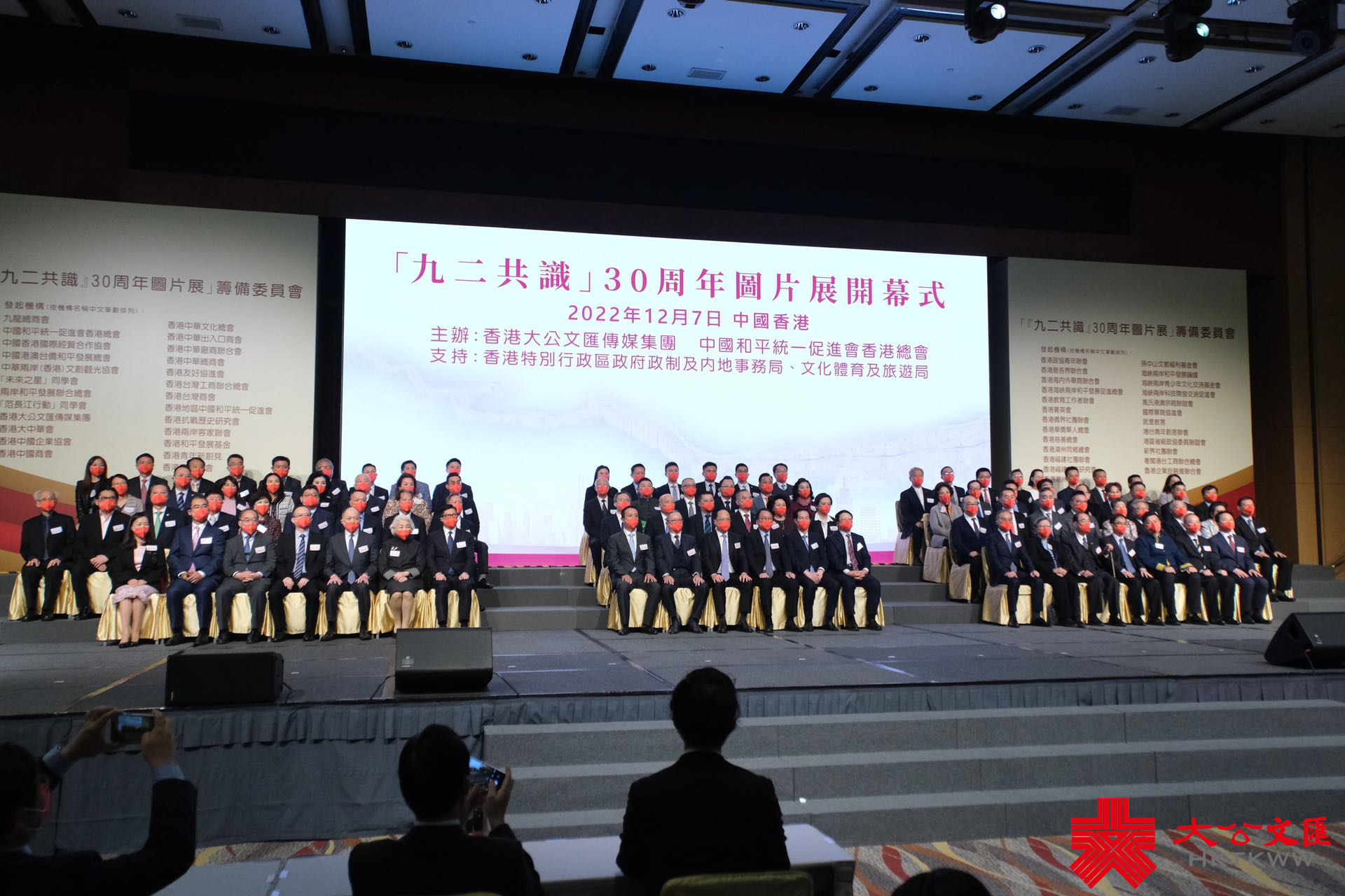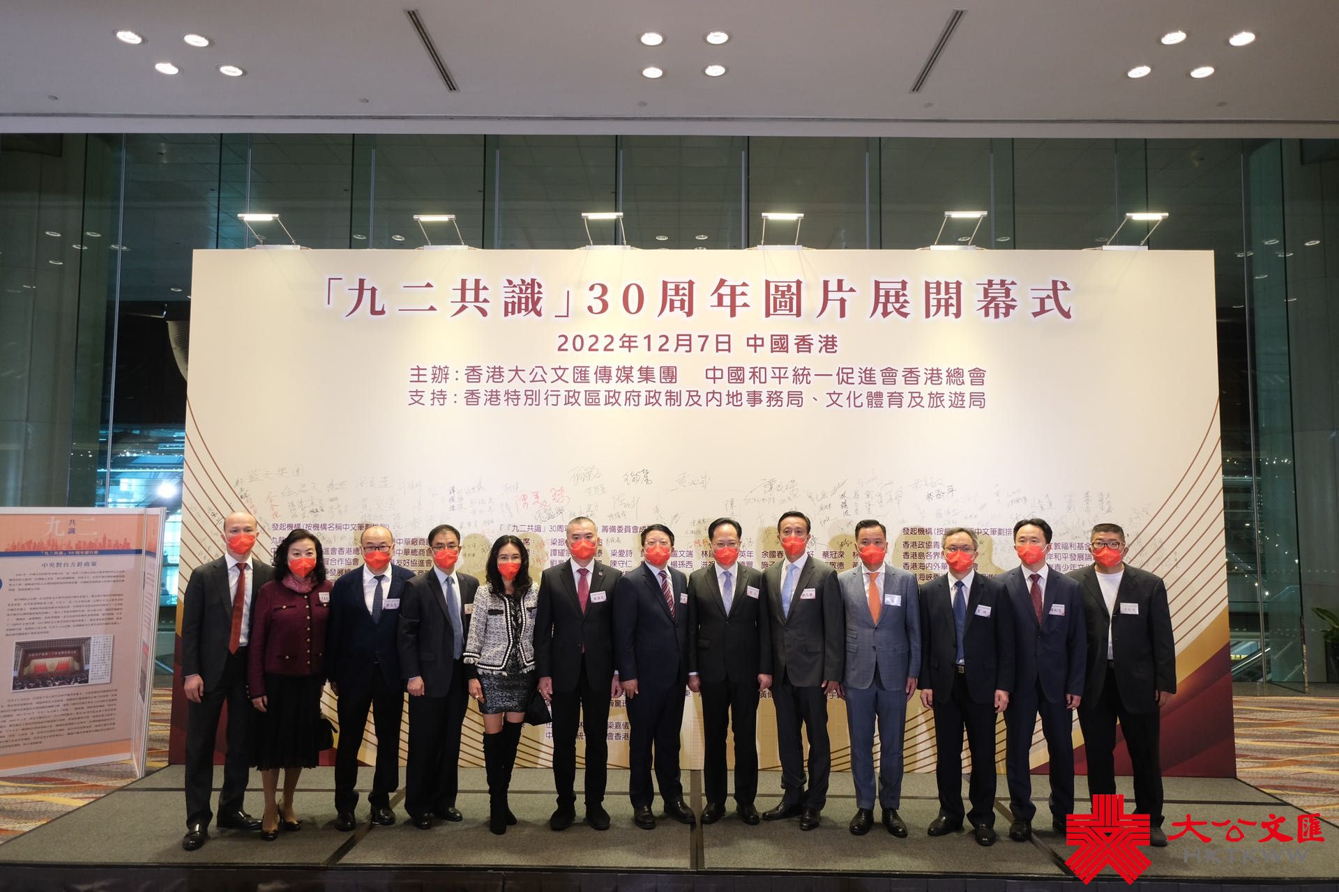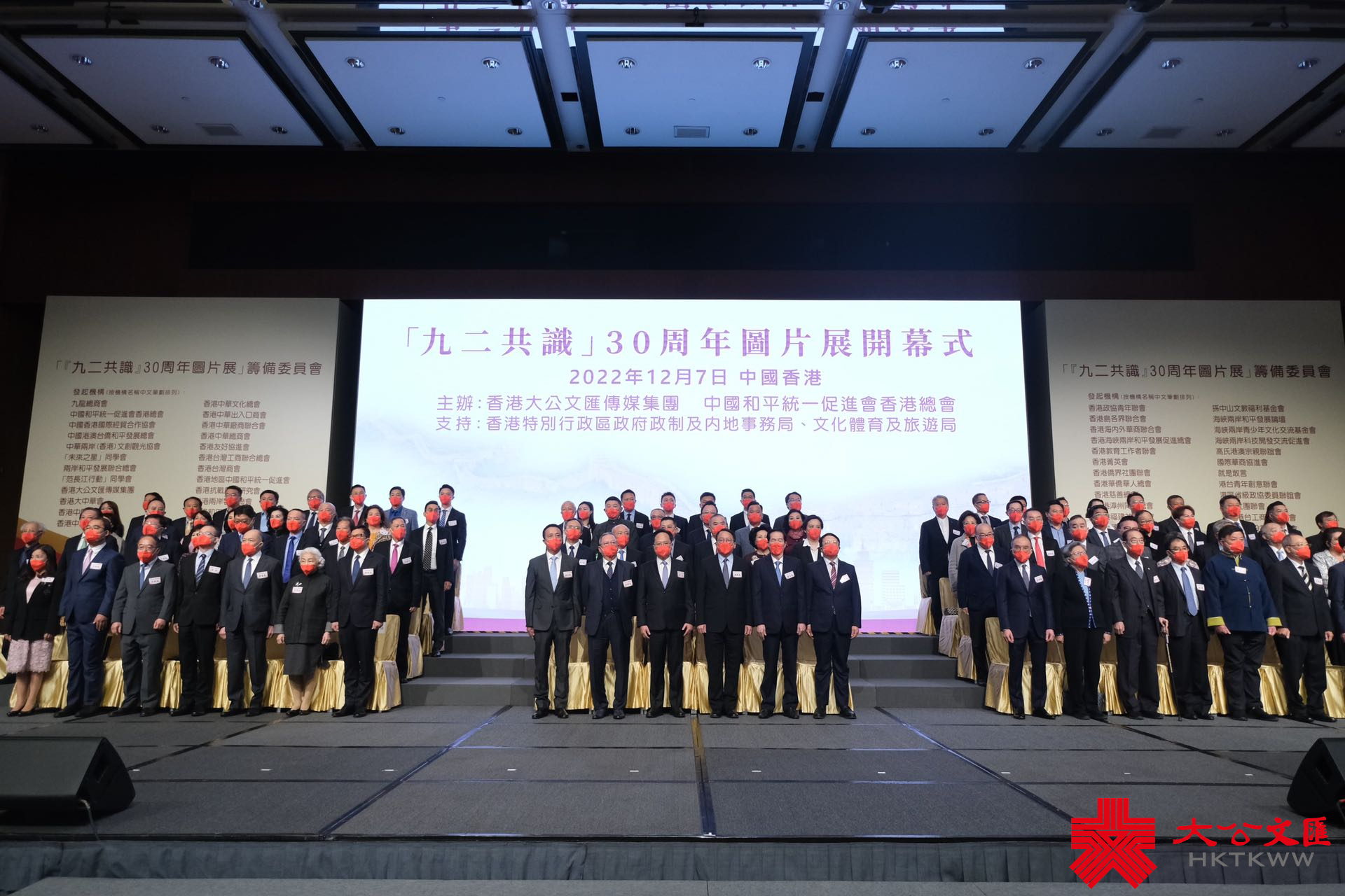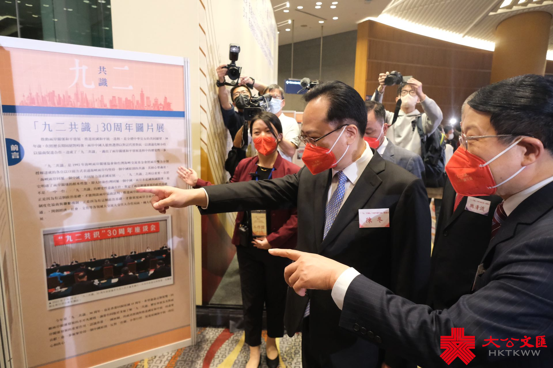大公文匯全媒體報道,今年是「九二共識」30周年,也是香港回歸祖國25周年。香港大公文匯傳媒集團和中國和平統一促進會香港總會於今日(7日)下午在香港會議展覽中心聯合舉辦「九二共識」30周年圖片展開幕式。香港中聯辦副主任陳冬,香港特區政府政務司司長陳國基,籌委會主席、全國政協委員、中國和平統一促進會香港總會會長姚志勝,籌委會主席、香港大公文匯傳媒集團董事長、總編輯兼社長李大宏等出席。全國政協副主席梁振英,中共中央台辦、國務院台辦主任劉結一發表視像致辭。
