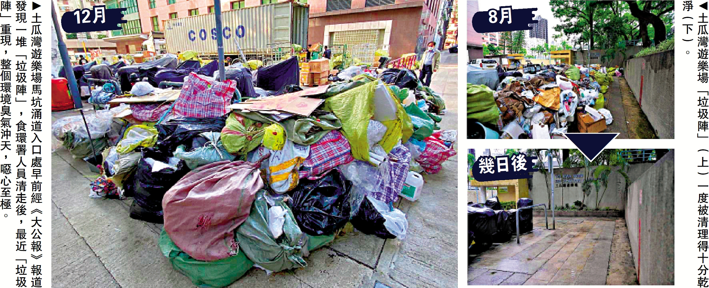 政府早前展開全城大清潔行動期間,《大公報》同步推出衞生黑點追蹤系列報道及舉報熱線,當時,土瓜灣遊樂場馬坑涌道入口處驚現一堆20米長、2米闊的「垃圾陣」,經報道後曾有工作組及食環署等人員清走,惟「垃圾蟲」一而再、再而三重建垃圾堡壘,人員連番打擊清潔似乎陷入了治標不治本困局。記者昨日回訪上址,發現該堆垃圾和雜物的種類包羅萬有,其中「有料」膠樽及變壞了的食物等招惹大量蒼蠅和蟑螂,更令整個環境臭氣沖天,噁心至極。
