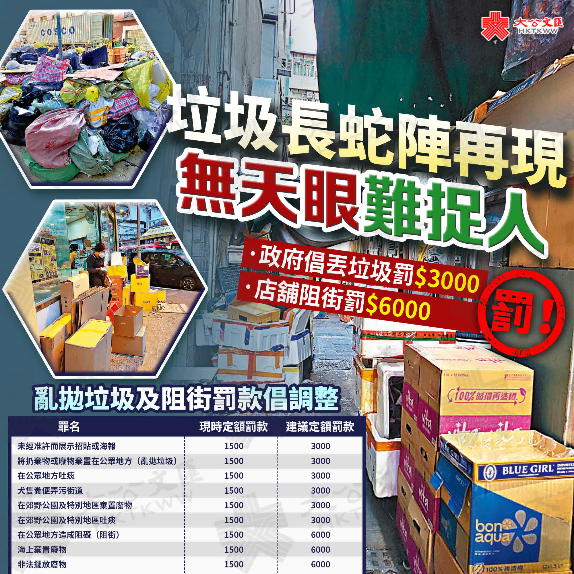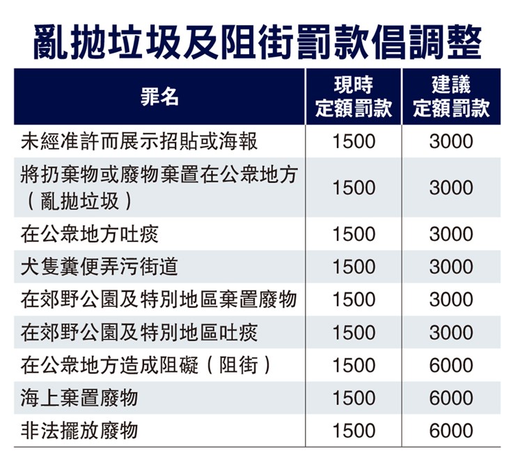 (大公報記者 葉浩源、古倬勳)政府昨日向立法會建議,將目前亂拋垃圾等定額罰款由一千五百元加一倍至三千元;店舖阻街等則由一千五百元大增三倍至六千元,被視為過去四個多月全城大清潔行動的後續,市民關注新方案終歸能否治本。