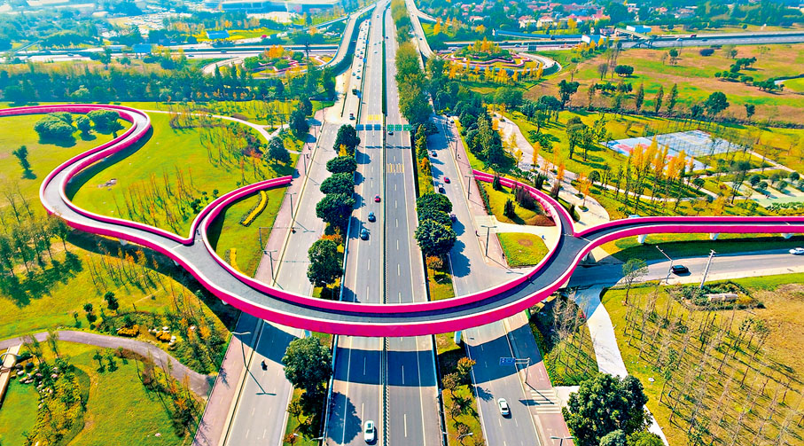 成都繞城綠道共有78座景觀橋,有的似彩虹,有的似彎月,一橋一景儀態萬方。從桂溪生態公園往青龍湖方向,第一座較大的景觀橋便是「蓉遵·飛龍橋」。一條「紅絲帶」跨過道路、越過河流,在廣袤的城市空間隨風起舞;跨線處的索網狀構造猶如三對薄薄的翅膀,整座橋樑勢如飛龍。這座橋全長1221米,跨越成自瀘高速,連接中和濕地與白鷺灣濕地,與周邊的環境渾然天成。