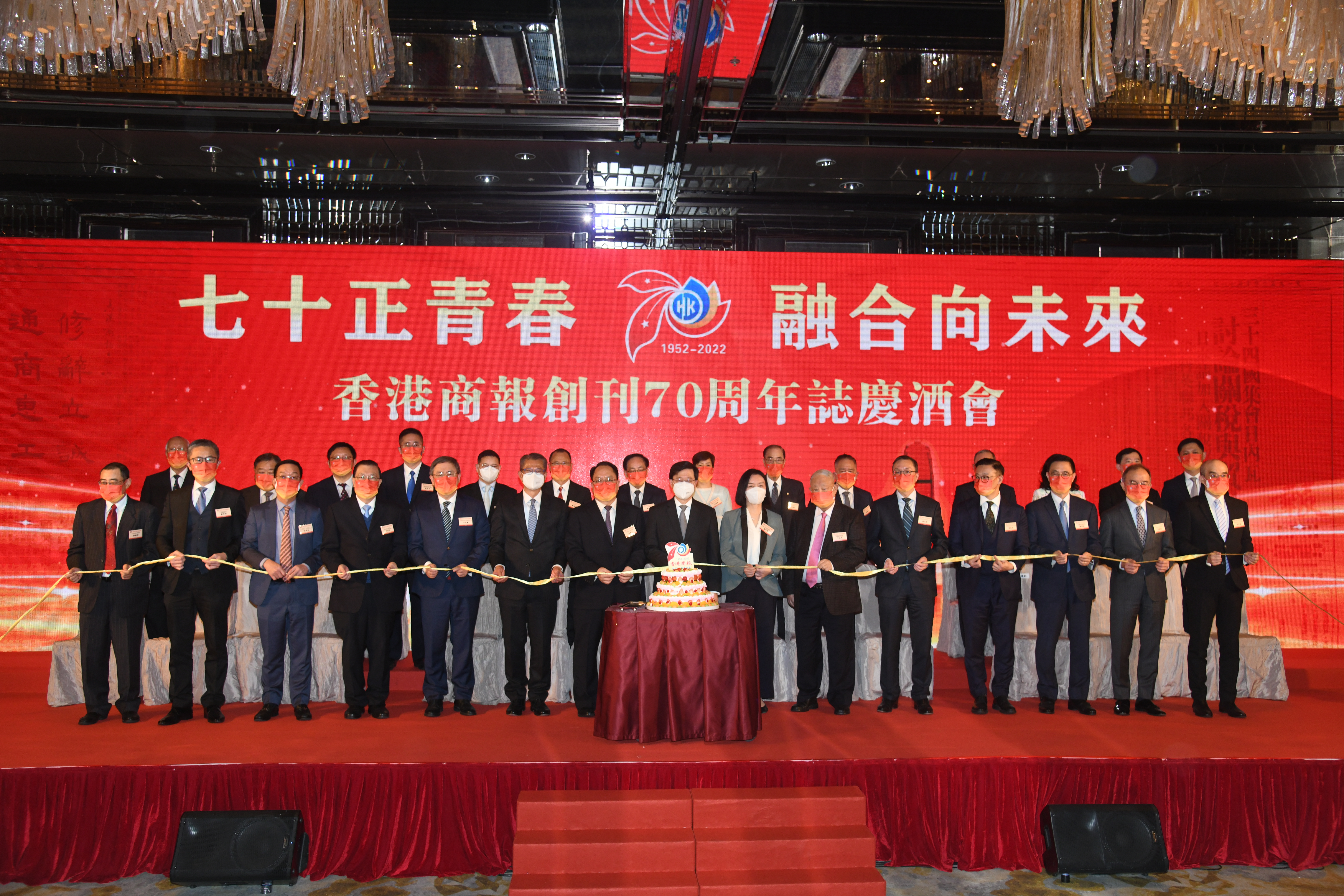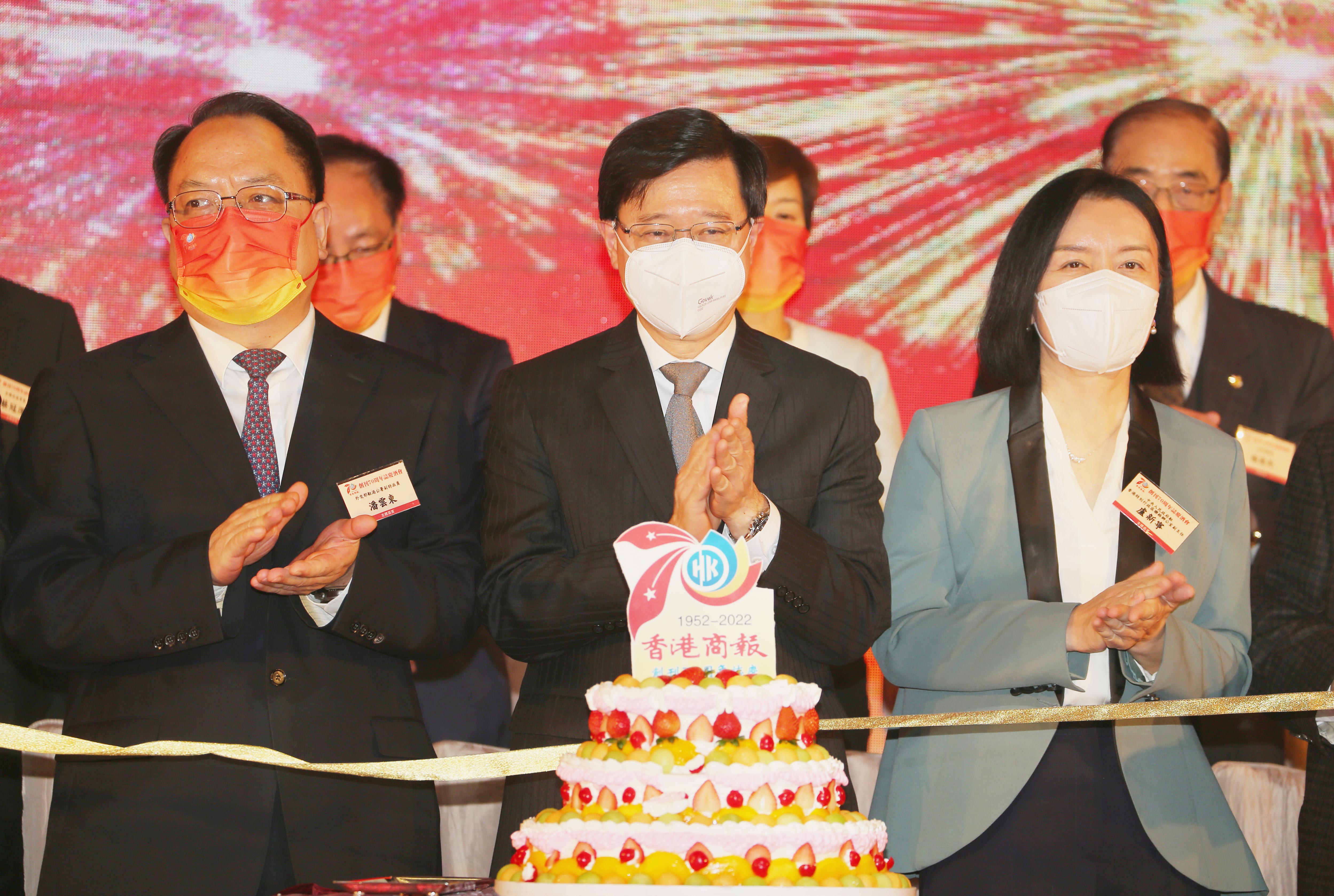 酒會上,李家超還與盧新寧、潘雲東、陳茂波、林定國等一眾嘉賓和陳寅社長一起為香港商報七十華誕切蛋糕。