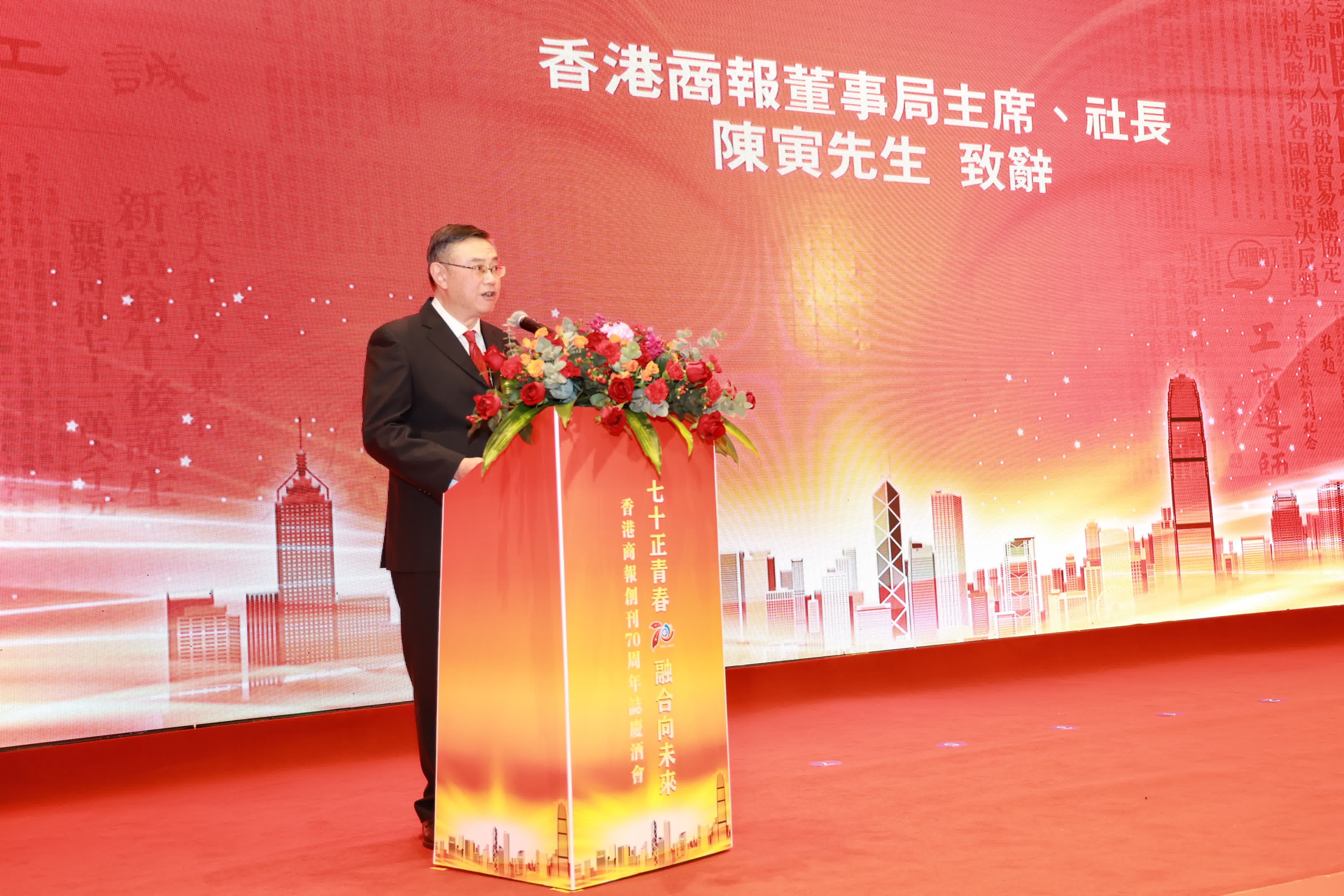 陳寅表示,在熱烈慶祝香港回歸祖國二十五周年這個特別的年份,香港商報迎來創刊七十周年。回望七十年歷程,香港商報秉承愛國愛港之初心和理念,始終與香港這座城市命運相連,榮辱與共;始終與香港廣大市民同聲共氣,同頻共振;記錄了東方之珠的傳奇故事,見證了「一國兩制」的成功實踐,自身也融入其中成為此偉大歷史洪流之奔湧浪花。
