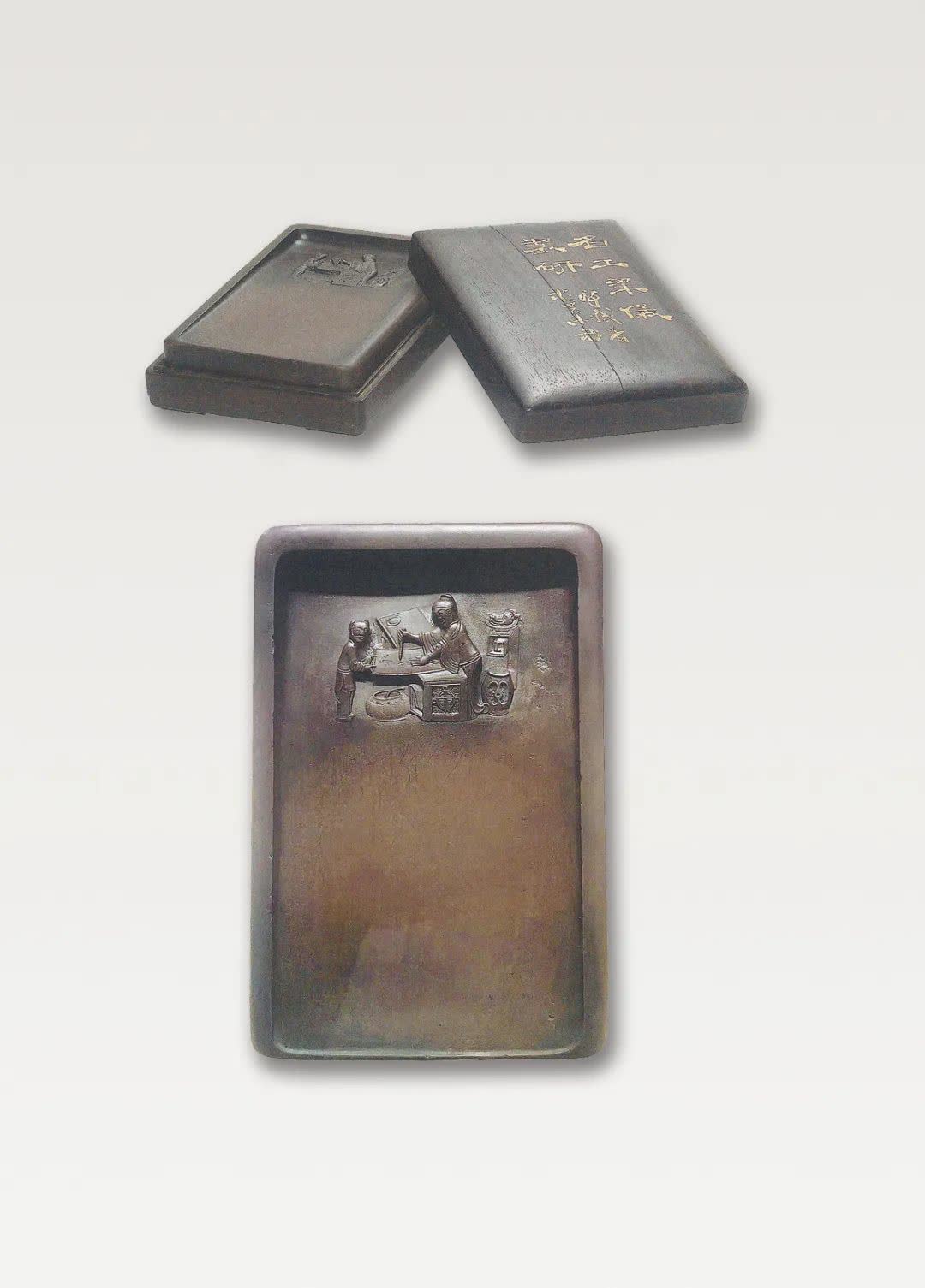 此端州水坑硯,質細潤,色青絳,硯面呈大片魚仔青花、火捺、黃龍等,妙物。此硯下端無堵,微淌,更妙者在落潮處,雕鐫了一幅有情景的書齋人物圖。開光圓凳,瓷洗銅勺,一盆佛手置於回紋的擱几上,大回紋托泥畫案置橢圓硯,一老叟站立懸臂作書,書童對向抽紙,陳設古雅,氛圍靜好,拙趣洋溢。硯側有梁儀作楷書款。良駿配寶鞍,此等好硯由名匠精心構圖施藝,得其所哉。