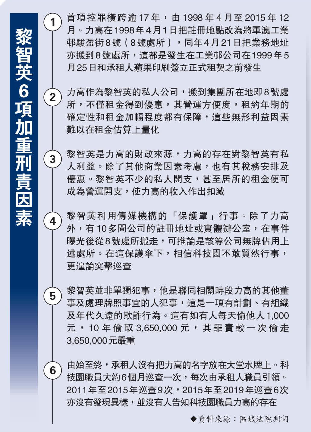 陳官列出黎智英6項加刑因素(見下表),質疑傳媒機構容許其他公司無牌佔用一處地方辦公,是濫用傳媒形象作為「保護罩」,而黎智英在相關時段管控壹傳媒集團,在此「保護傘」下行事,令科技園不敢貿然行事,且本案涉及多人犯事,屬有計劃、有組織的年代久遠欺詐行為,承租人沒把力高放在公司大堂水牌位置,亦沒有告知科技園,是濫用政府批出的土地,令承租人自肥,打擊科技園的政策措施。