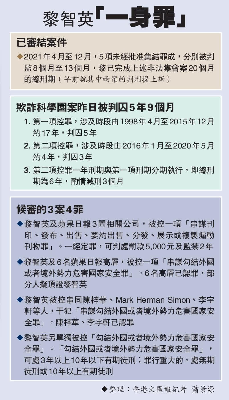 (香港文匯報 記者 葛婷)壹傳媒集團創辦人黎智英,向科技園公司隱瞞力高顧問公司使用蘋果大樓而違反租契,受審後被裁定兩項欺詐罪成,昨日在區域法院被判囚5年9個月。法官陳廣池列出黎智英加重刑責的6個因素,批評這是一項有計劃、有組織,為時21年的欺詐,有如長年累月偷竊別人的錢。由始至終,黎智英都是重要角色,其惡劣之處在於濫用傳媒機構作「保護傘」犯案,令科技園「投鼠忌器」。他強調,法律面前人人平等是公認的法治精神,高官權貴都要面對相同的法治標準及約束,黎智英掌控傳媒,不代表他不會犯法,更不能將對他提出檢控說成打擊新聞自由。本案純屬簡單欺詐案,不應將審訊扣上政治帽子。