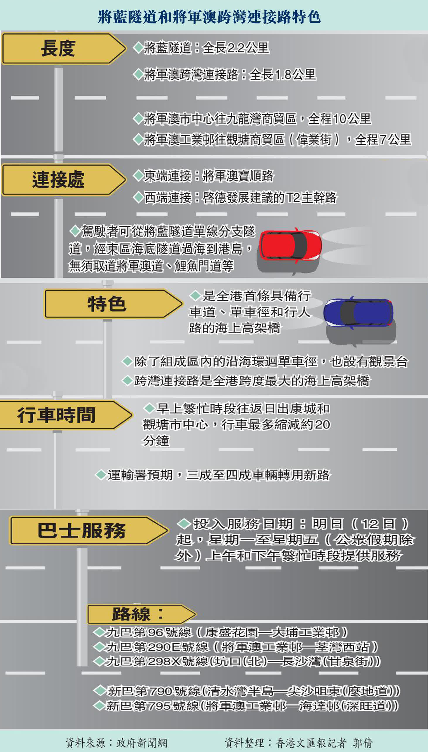 將軍澳居民期待已久的將藍隧道和跨灣連接路,昨日由特區行政長官李家超等主持通車儀式。李家超乘坐私家車到將藍隧道,參觀了2.2公里長的管道。他聽取土木工程拓展署署長方學誠解說後,一行人乘坐巴士穿越隧道,參觀隧道連接1.8公里長的將軍澳跨灣大橋。之後,他們乘搭開篷巴士返回將藍隧道將軍澳出入口出席通車儀式。