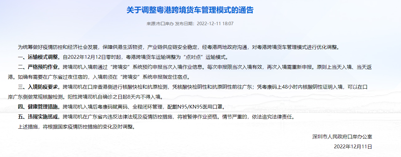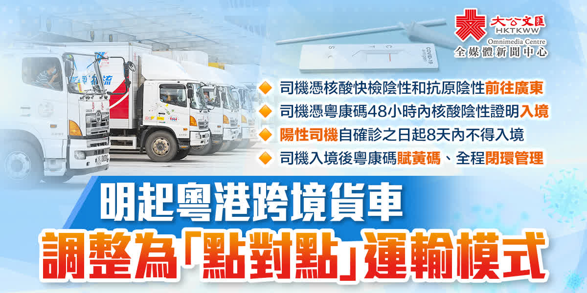 深圳市政府口岸辦公室今日晚上發布通告,表示為統籌做好疫情防控和經濟社會發展,保障供港生活物資,產業鏈供應鏈安全穩定,經粵港兩地政府溝通,對粵港跨境貨車管理模式進行優化調整。粵港跨境貨車明日(12日)凌晨零時起,調整為「點對點」運輸模式。