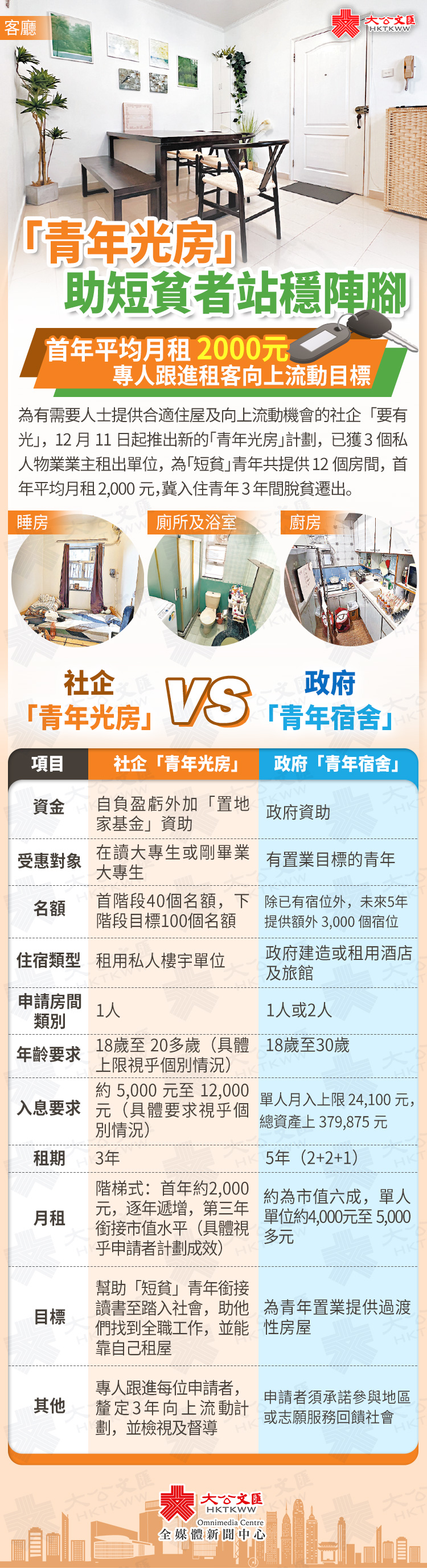 2020年的香港貧窮情況報告顯示,全港有約160萬貧窮人口,其中16萬貧窮人口出現向上流動困難的問題,被社企「要有光」稱為「短貧戶」;當中一成、即約1.6萬人又被稱為「短貧」青年,他們多數是讀於大專院校或剛畢業的自食其力青年,卻面對棘手的住屋問題。為有需要人士提供合適住屋及向上流動機會的社企「要有光」,12月11日起推出新的「青年光房」計劃,已獲3個私人物業業主租出單位,為「短貧」青年共提供12個房間,首年平均月租2,000元,冀入住青年3年間脫貧遷出。「青年光房」計劃都有哪些亮點?給「短貧」青年帶來哪些協助?快來一圖睇清!