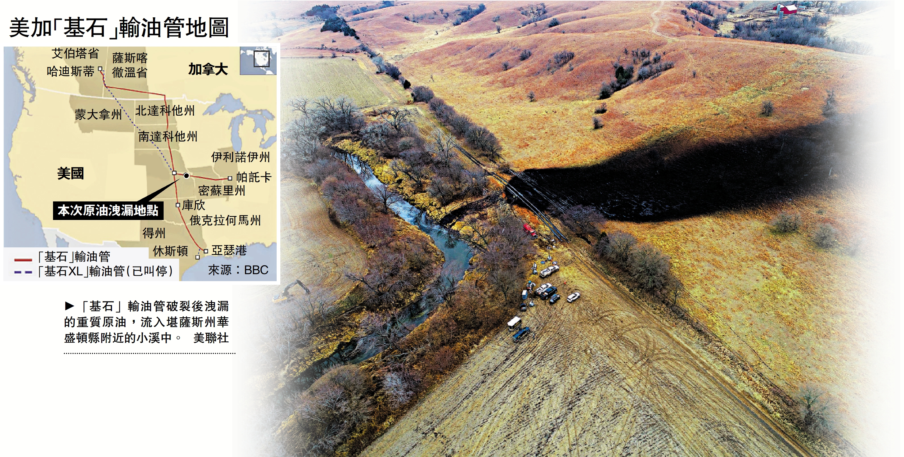 大公報綜合路透社、美聯社報道,加拿大向美國輸送原油的「基石」(Keystone)管道破裂,導致逾1.4萬桶的原油流入堪薩斯州的一條小溪,釀成美國近10年來最嚴重的漏油事故。