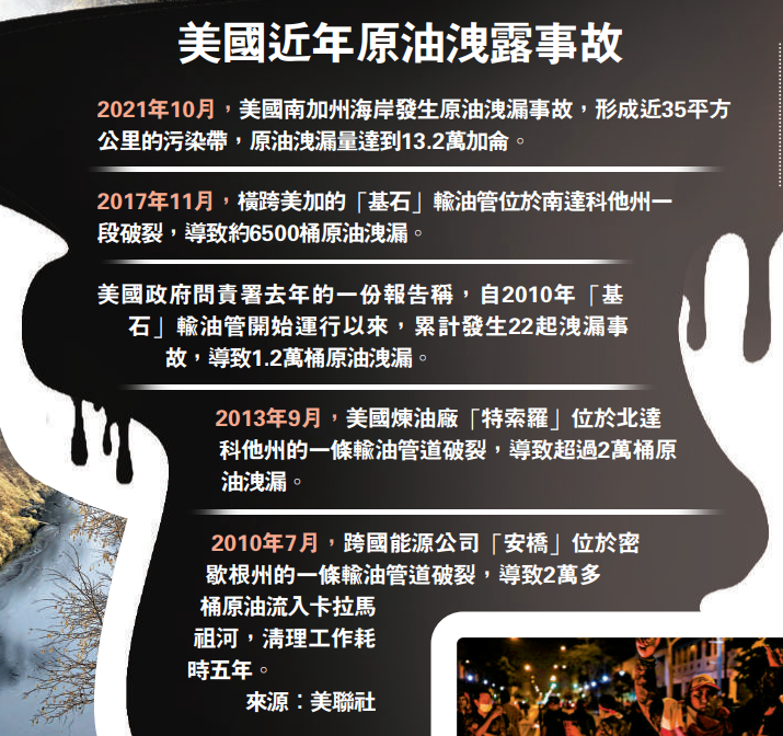 美加輸油動脈「基石」輸油管7日晚關閉,運營商加拿大TC能源公司8日表示,管道位於美國境內的一段發生原油洩漏,初步估計洩漏量為1.4萬桶,是美國近10年來最大的原油洩漏事件。TC能源公司11日表示,250名工作人員正在進行搶修和打撈工作,暫未找到原油洩漏的原因,也不能確定恢復運營的時間。