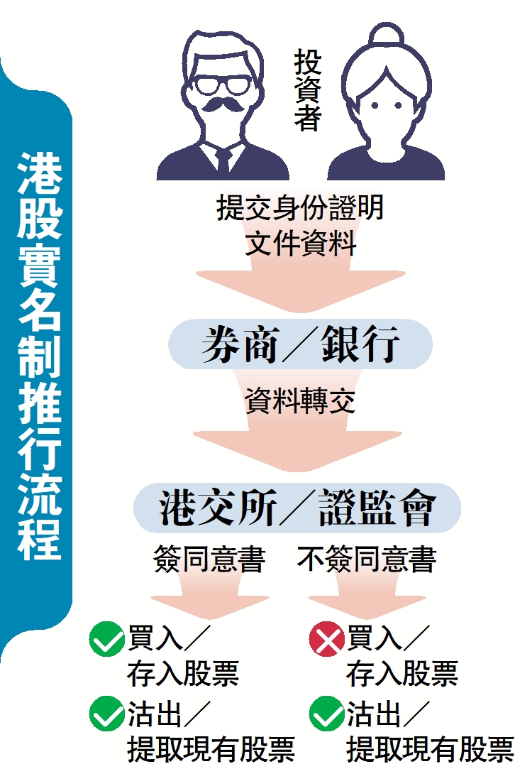 港股實名制推行後,證券行及銀行需要將旗下客戶的身份資料提交予港交所(00388)及證監會,在提交前需客戶簽署同意書,若拒絕簽署則隨後的股票購買及存入將受到限制。對於個人客戶而言,需要提交包括身份證明文件上的姓名、該文件簽發地、類別及號碼等資料。