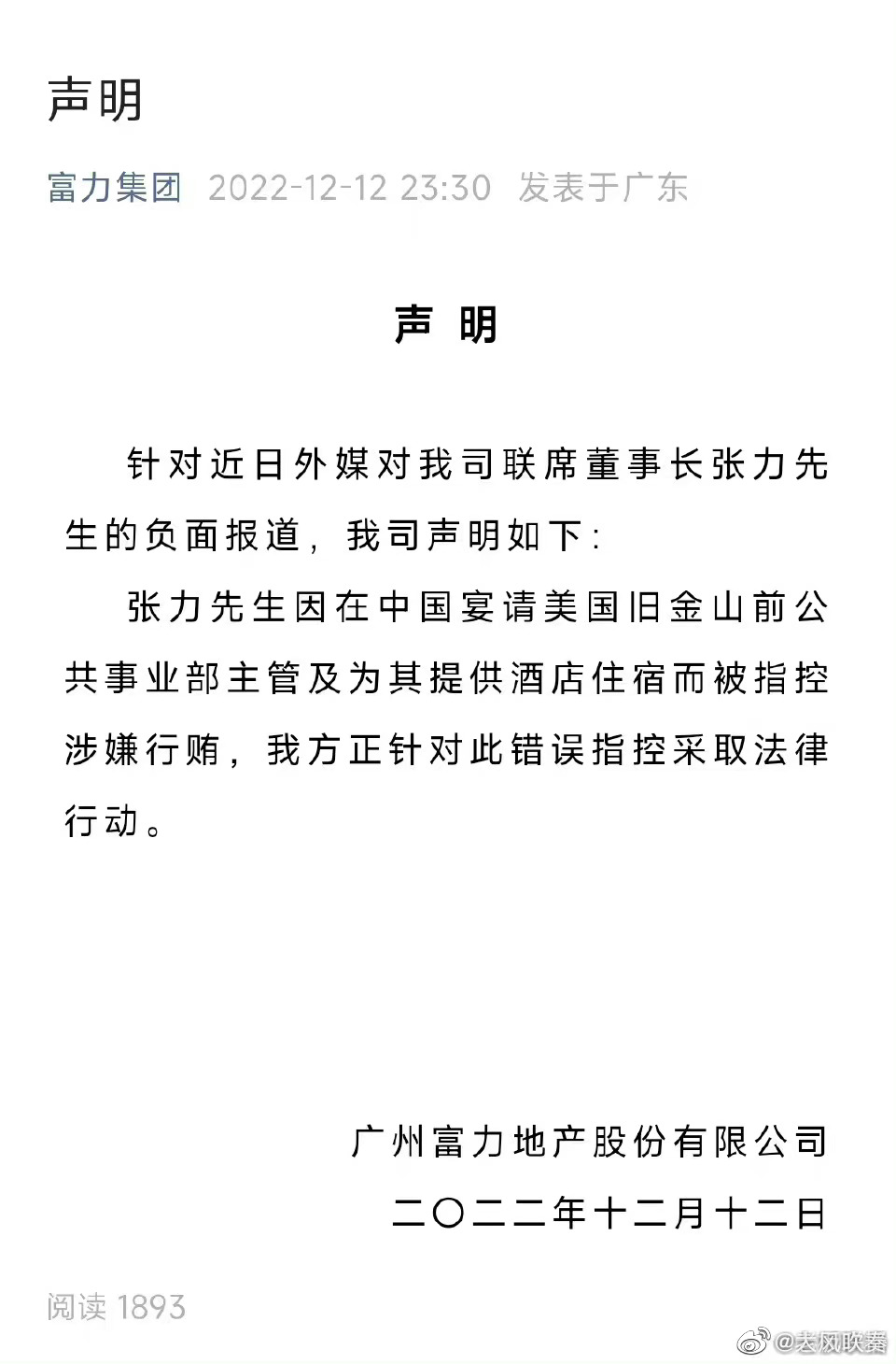 富力集團昨日(12日)深夜發聲明澄清,指張力因在中國宴請美國三藩市前公共事業部主管,為對方提供酒店住宿而被指控涉嫌行賄,富力集團正針對這項錯誤指控採取法律行動。