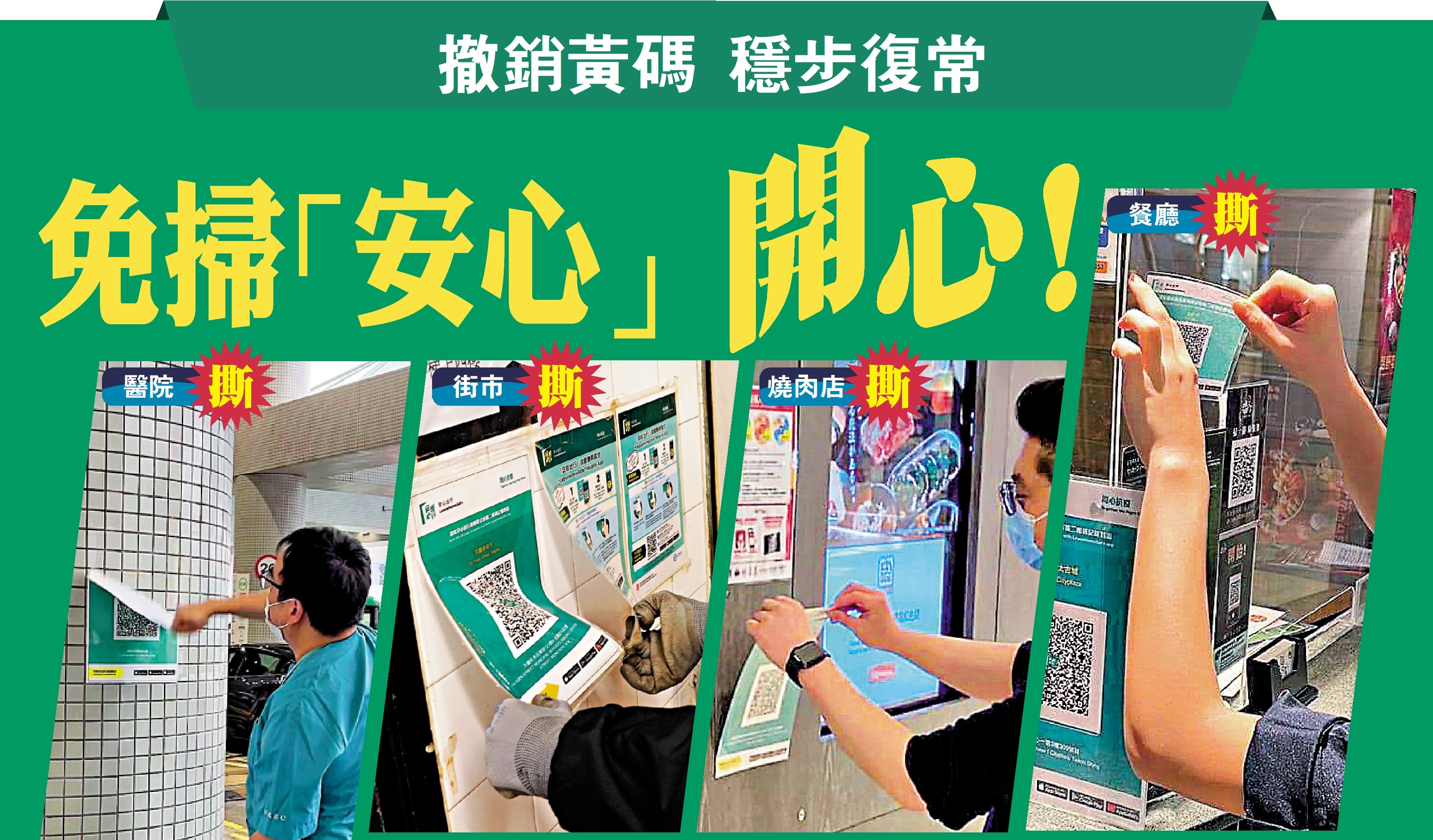 政府昨日公布五項調整防疫措施,在旺角花園街街市,昨晚接近八時街市關閉,大公報記者見到工作人員撕走在各個出入口的所有「安心出行」二維碼;在東區醫院,有穿制服的人員昨午已撕走醫院大樓外的「安心出行」二維碼。叙福樓集團主席兼行政總裁黃傑龍表示,旗下所有分店將保留入口處一個二維碼,他形容「取消安心出行係歷史性嘅一步。」