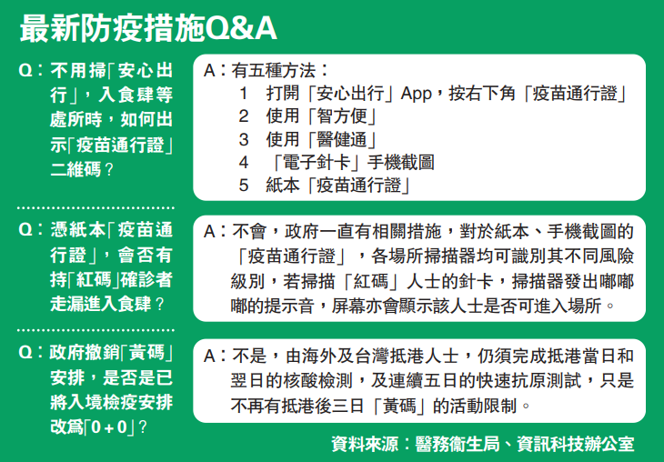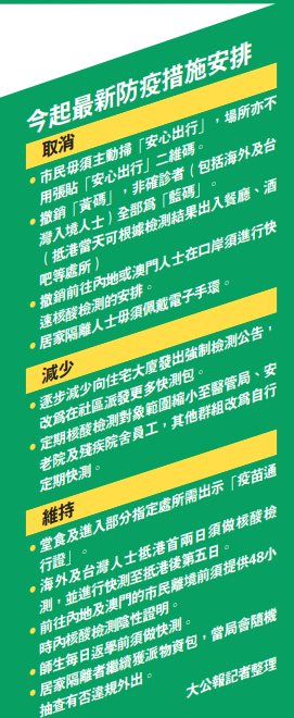 實施兩年多的「安心出行」步入歷史,街市、食肆昨晚陸續撕走「安心出行」二維碼。商界、旅遊業、餐飲業喜迎新安排;市民大讚積極調整措施便利出行,認為「疫苗通行證」仍需保留。醫務衞生局局長盧寵茂表示,冬季病毒活躍,市民應盡快打齊針。專家表示,本港尚未走出疫情,「疫苗通行證」可提醒市民打針,令復常路走得更穩妥。
