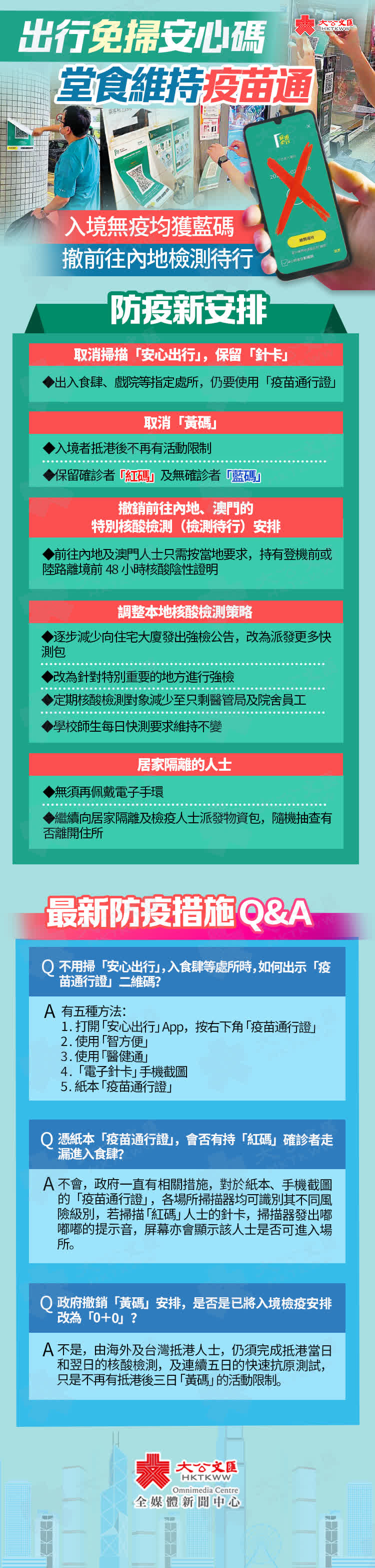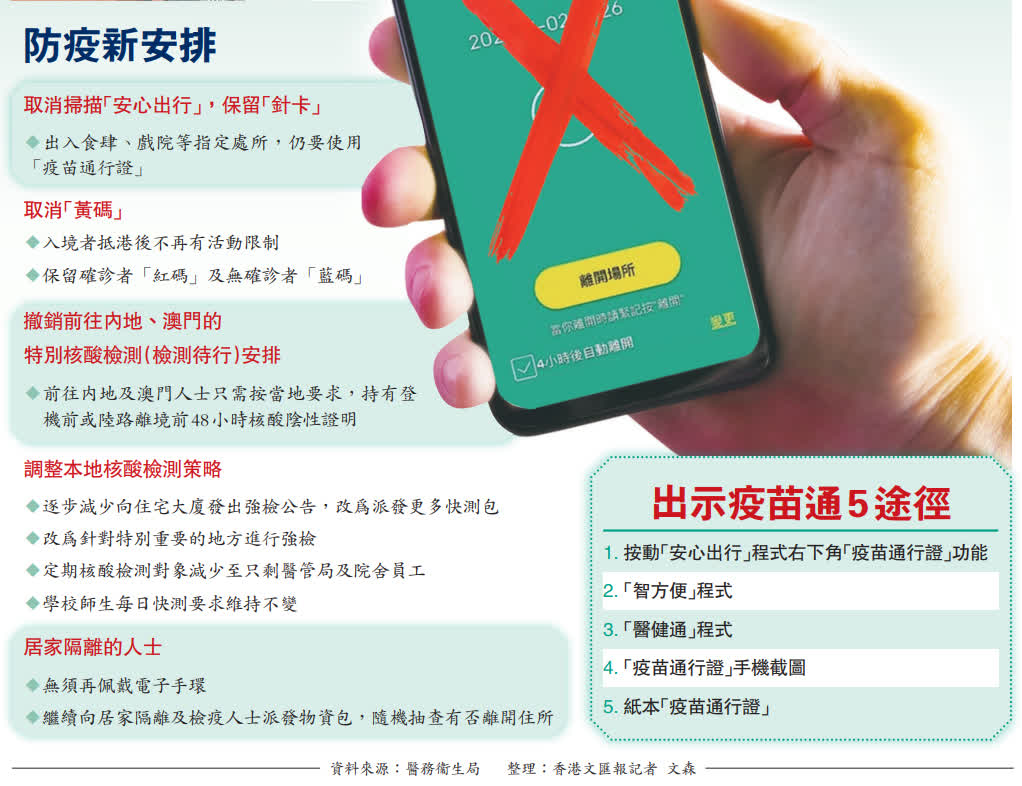 (香港文匯報 記者 張弦)香港復常路再邁進重要一步。香港特區政府昨日宣布,市民今日起進入場所不需再掃「安心出行」二維碼,但進入食肆等處所仍要出示「疫苗通行證」或針卡;抵港者的「黃碼」也被撤銷,確診者的「紅碼」則維持;其次是減少強檢、免除確診者戴手帶,以及撤銷往內地、澳門的檢測待行安排。醫務衞生局局長盧寵茂解釋,仍保留「疫苗通行證」只為鼓勵市民打針,特別是「一老一幼」。有防疫專家認為,措施符合公眾期望,「疫苗通行證」目前仍有必要維持。