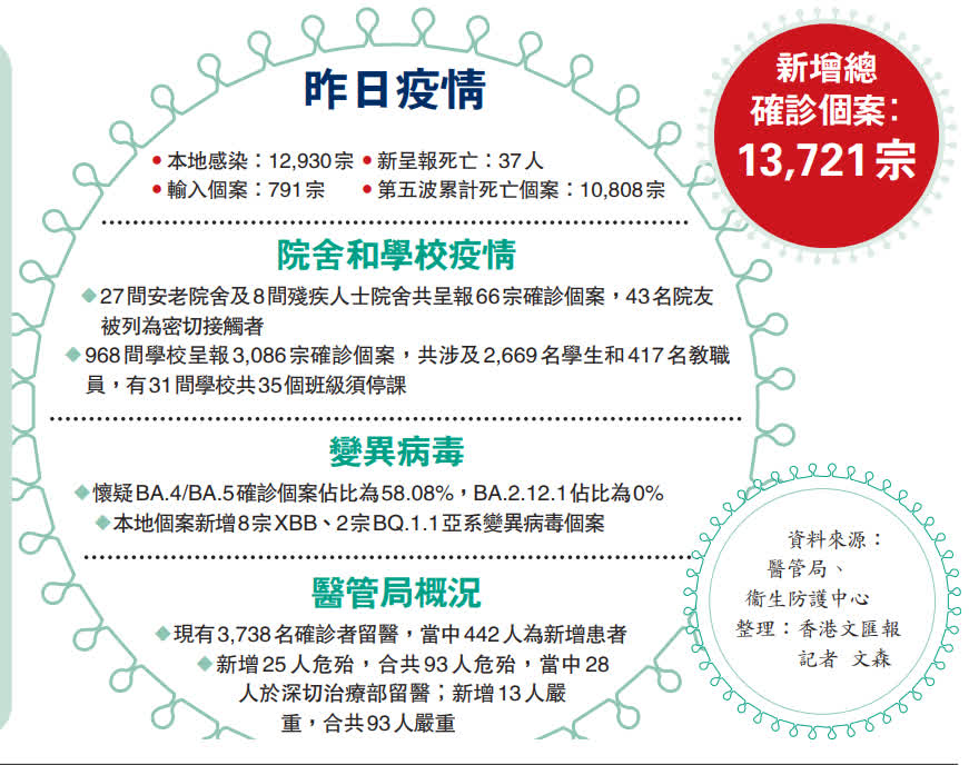香港昨日新增13,721宗新冠肺炎確診個案,再多37名患者死亡。醫管局表示,過往統計疫情死亡數字,會計及離世前28天確診的病人,包括一些康復者,以及死亡原因未必與新冠有關個案,未來只會集中公布與新冠肺炎病情有關的死亡個案。另外,因應院舍確診個案持續增加,現時5間隔離確診長者的暫託中心入住率上升,社署於亞博館合共增開666張床位。