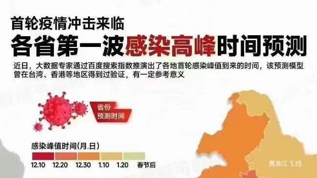 大公文匯全媒體報道,內地新冠疫情持續,早前防疫「新十條」出爐,允許無症狀及輕症居家隔離。國家衞健委宣布,今日(14日)起不再公布無症狀感染者數據。近來,一張名為「首輪疫情衝擊來臨 各省第一波感染高峰預測」的圖片在內地各大互聯網平台廣為流傳,引發熱烈討論。