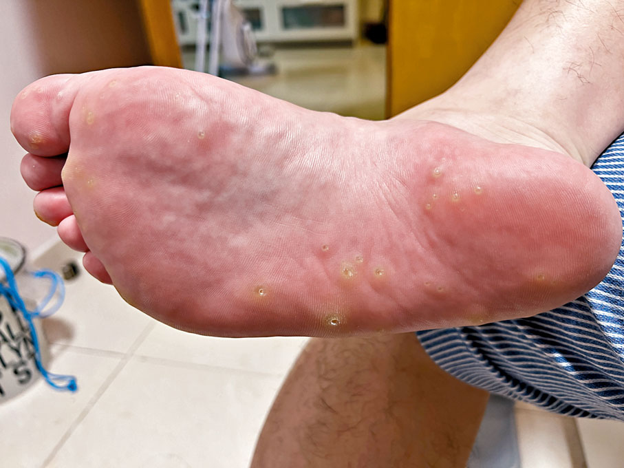 他遂預約公立醫院門診,惟當時遭逢新冠肺炎第五波疫情最嚴重的時期,「根本預約唔到期,我就效法網民的經驗,用白醋泡腳、水楊酸去死皮。」然而,這些方法治標不治本,更延誤治療,導致足底疣擴散,由最初單腳受感染惡化至雙腳都有患處,最嚴重時多達數十個患處,「陣時已經痛到無法企,行路就好似踩鐵釘上面,但工作時需要走動,試過忍痛行一個鐘左右雙腳就麻木。」