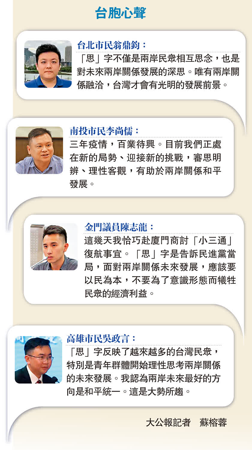 大公報報道,由兩岸有關機構共同主辦的2022海峽兩岸年度漢字評選結果日前在台北揭曉,「思」字以最高票當選。主辦方表示,「思」字既直接反映了兩岸民眾當下的心態,也隱喻兩岸關係近年來的走向,更昭示未來的趨勢。「思」字體現了時代變局中紛亂的思緒,彰顯了人們求變求新求破局的願望。站在新的歷史節點,如何進一步推動兩岸交流,達到心靈契合,同樣需要兩岸智者的深思。兩岸學者也認為,蔡英文當局破壞兩岸關係,損害兩岸民眾福祉,「思」反映了台灣民眾求變求新的強烈願望。
