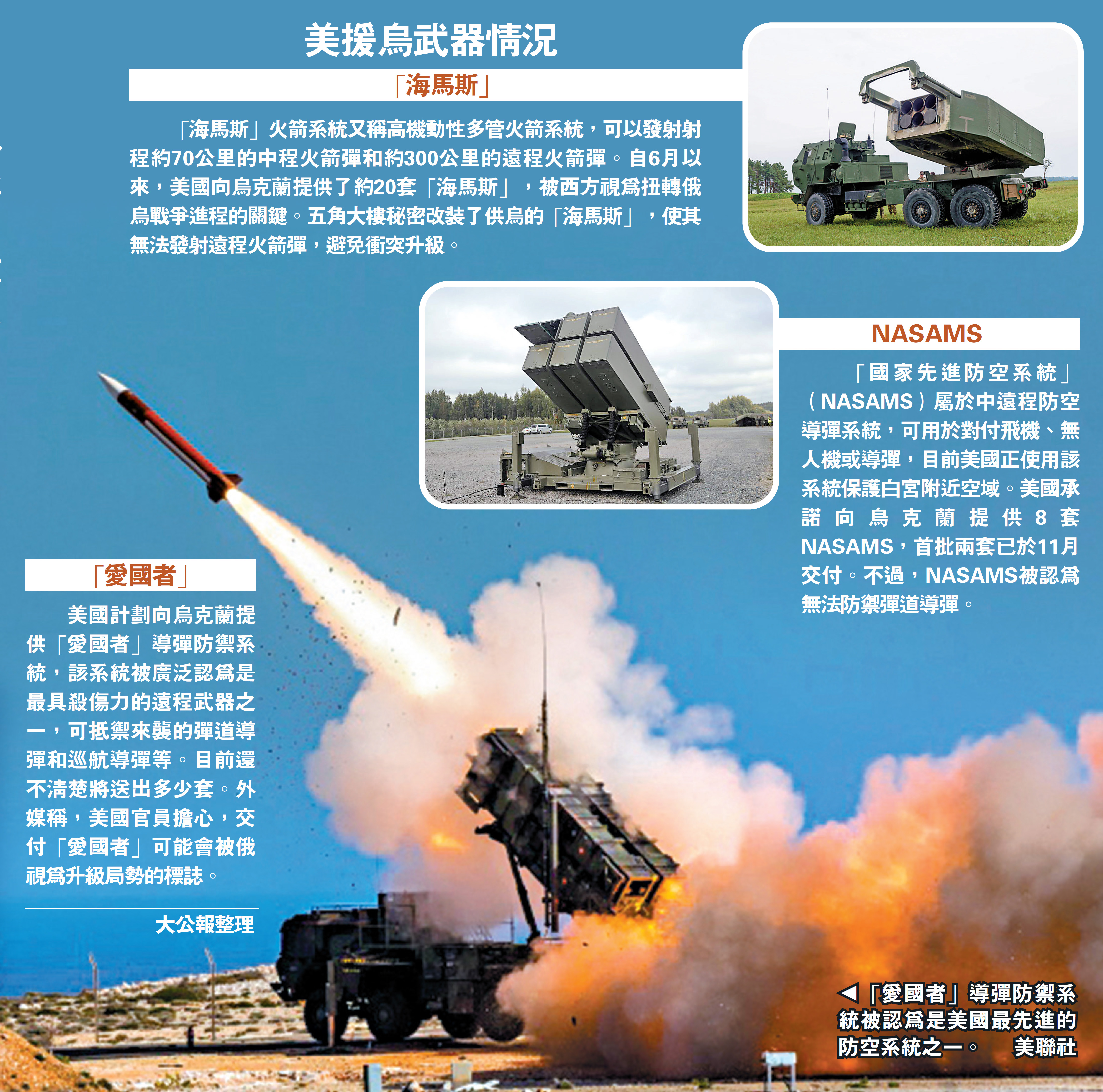 烏克蘭近期一直在呼籲美國向其提供先進的遠程防空系統,以抵禦俄羅斯導彈對烏能源基礎設施的密集襲擊。美國此前已承諾向烏克蘭提供8套「國家先進防空系統」(NASAMS),首批兩套已於11月交付。NASAMS可用於抵擋飛機、無人機或導彈,但無法防禦彈道導彈。