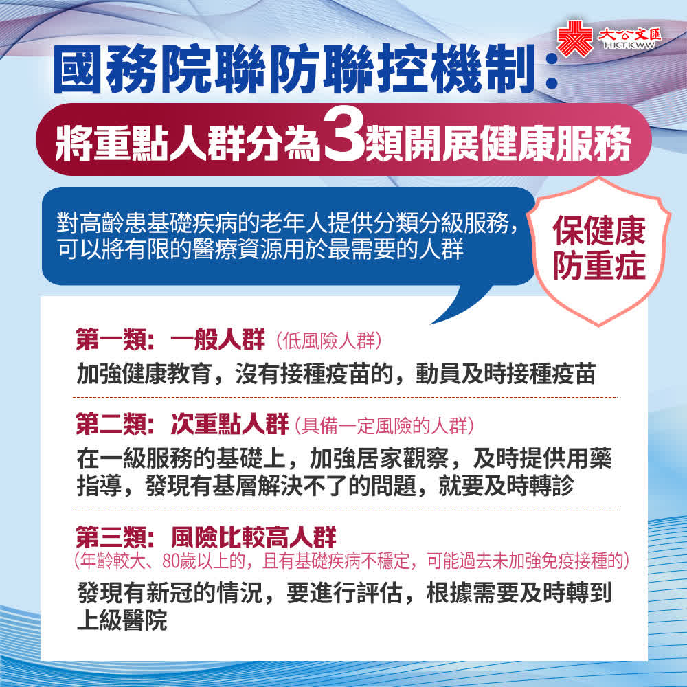 據央視新聞報道,近日,國務院聯防聯控機制綜合組發布了《新冠重點人群健康服務工作方案》,將重點人群分為三類開展健康服務。12月15日,國務院聯防聯控機制舉行新聞發布會,國家衞生健康委基層衞生健康司司長聶春雷介紹了有關情況。