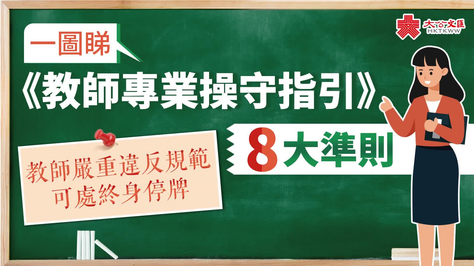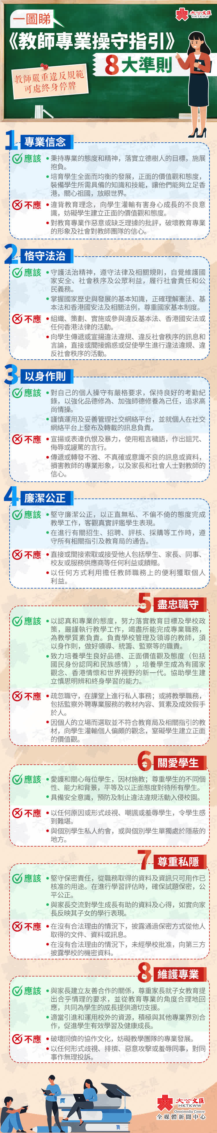 她指出,《指引》在制定時是考慮了香港教育體系的實際情況和現行法例,同時參考了不同國家和地區的教師專業標準等文件,從而歸納出教師應有專業操守八大準則,涵蓋個人修養、師德及教學專業要求,又列出在相應準則下教師40項「應該」及32項「不應」做的行為例子。