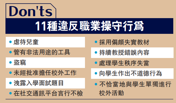 《指引》又要求教師不應作出令教師專業形象受損的行為,不應向學生灌輸有害身心成長的不良意識,對教育專業作惡意或缺乏理據的批評,宣揚或表達仇恨及暴力,鼓吹違反社會秩序的言論,縱容校園內潛在違法違規的活動,與個別學生私人約會、與學生有任何超越師生關係的交往、作出涉及性騷擾的行為或施行體罰等。