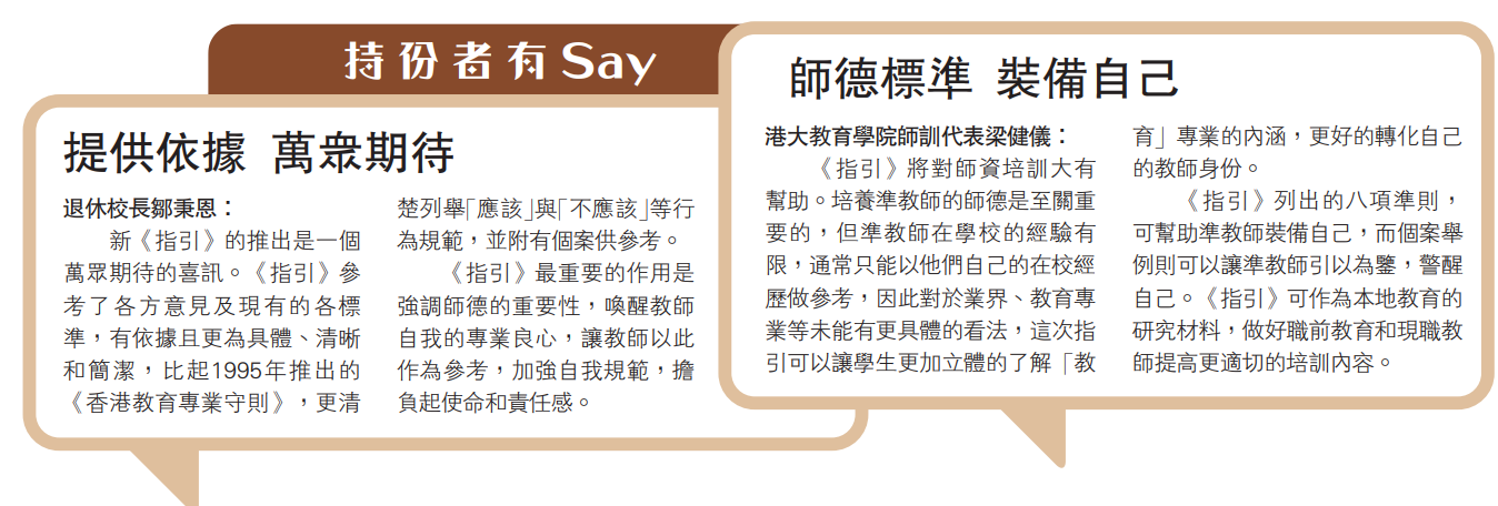 蔡若蓮說,「立德樹人是教育的根本任務。教師是學生的楷模,其言行、操守和價值觀對學生影響深遠。教育專業和個人修養應相結合,以達至以德育人」,教師應仔細閱讀《指引》,掌握對專業及個人行為的要求。