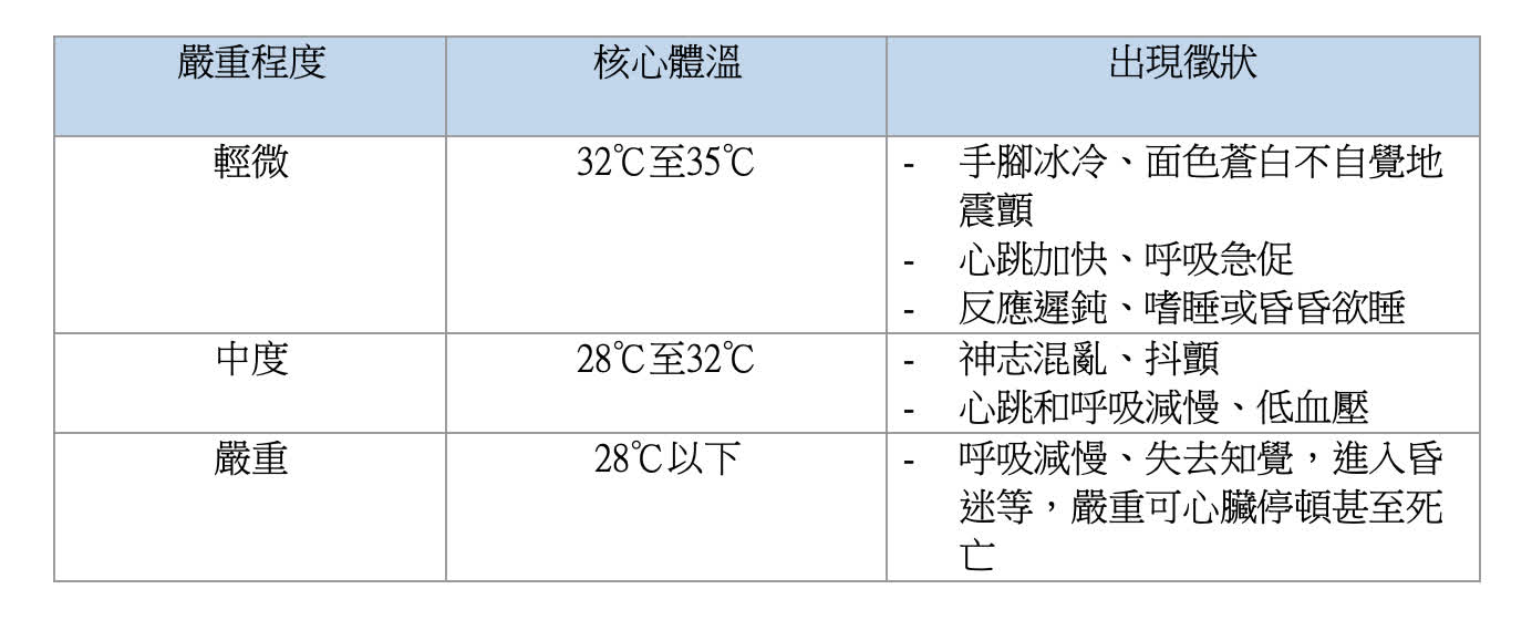 低溫症病徵因年齡、失溫程度和時間長短而有所不同,大致可分為三個階段 ── 輕微、中度或重度。
