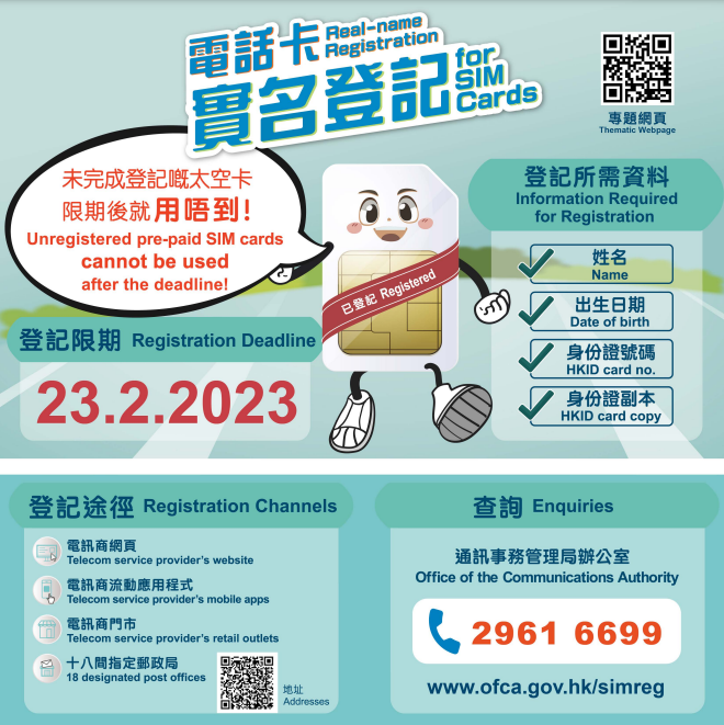 如欲獲取更多有關電話智能卡實名登記制的資訊,可瀏覽專題網站或致電通訊事務管理局辦公室熱線2961 6699,亦可參閱政府的相關宣傳資訊。