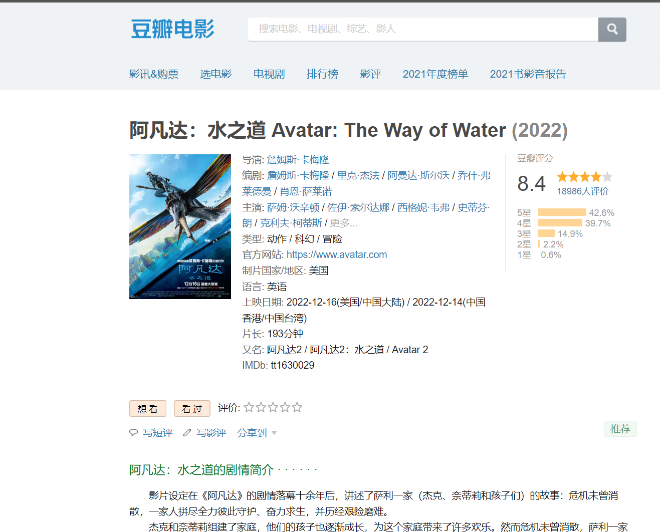 (大公文匯網 記者 郭瀚林)今日(16日),影迷們翹首以盼的《阿凡達2:水之道》在內地正式上映,據貓眼專業版數據,電影在上映首日的零點瞬間,內地總票房就已突破 1 億。截至發稿時間,電影在影評網站豆瓣網上的評分為8.4分,首批觀影評論也已經產生。
