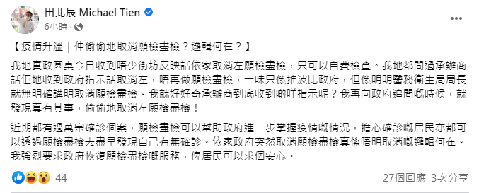 田北辰今日下午在Facebook發文,指有不少街坊反映「願檢盡檢」已被取消,只可以自費檢查。田又稱問過承辦商,對方指收到政府指示要取消;而他其後再向政府追問時,亦發現「真有其事」。田形容不明白政府在疫情升溫時突然取消「願檢盡檢」邏輯何在,並在帖文中強烈要求政府恢復服務,予市民可以求個安心。