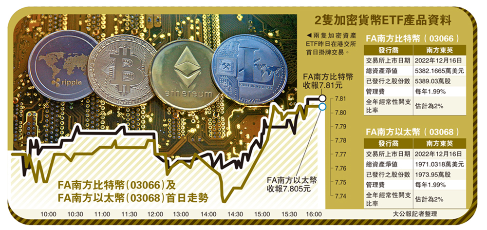 (大公報記者 許 臨)兩隻加密資產ETF昨日在港交所首日掛牌交易,並成為亞洲首批加密貨幣ETF。港交所表示,這有助進一步擴大其產品生態圈,為香港及國際投資者提供更多選擇。FA南方比特幣(03066)及FA南方以太幣(03068)均由南方東英發行,按證監會指引只投資比特幣期貨和以太幣期貨,不會直接投資加密貨幣。