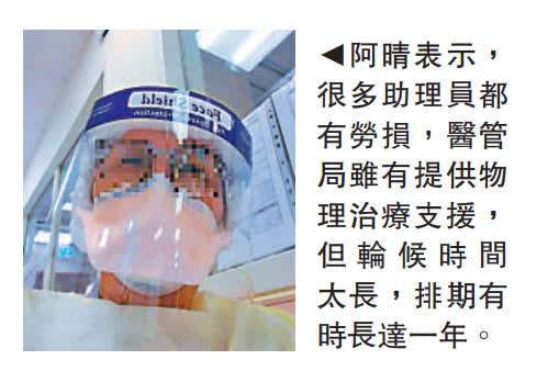 一間病房人手最少時只有三名助理員,面對長期的人手不足,院方唯有透過調配人手,每當需要換片和沖涼,就從其他病房調來一至兩人協助,但實際上只是「十個煲、七個蓋」,沒有真正解決問題。阿晴說,很多助理員的手腕、肩膀都有勞損,醫管局有提供物理治療支援,但輪候需時,排期有時長達一年,「最痛的時候,根本幫不到你。」