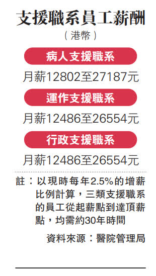 在醫管局招聘網站的百餘個職位中,除了零星幾個保安員、維修技工職務外,其餘均為助理員工作,顯示相關人手嚴重不足,但涉及病人支援職系員工薪酬偏低,起薪點只有12802元,以現時每年2.5%的增薪幅度計算,要達至頂薪27187元,需約30年的時間。