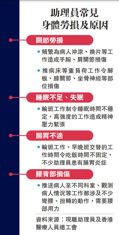 病人難以獲得適切照顧,助理員也被各種痛症纏身。香港醫療人員總工會表示,腸胃病、失眠、關節勞損等已成為醫院助理員的職業病。當局應重視護工問題,不能再拖了。