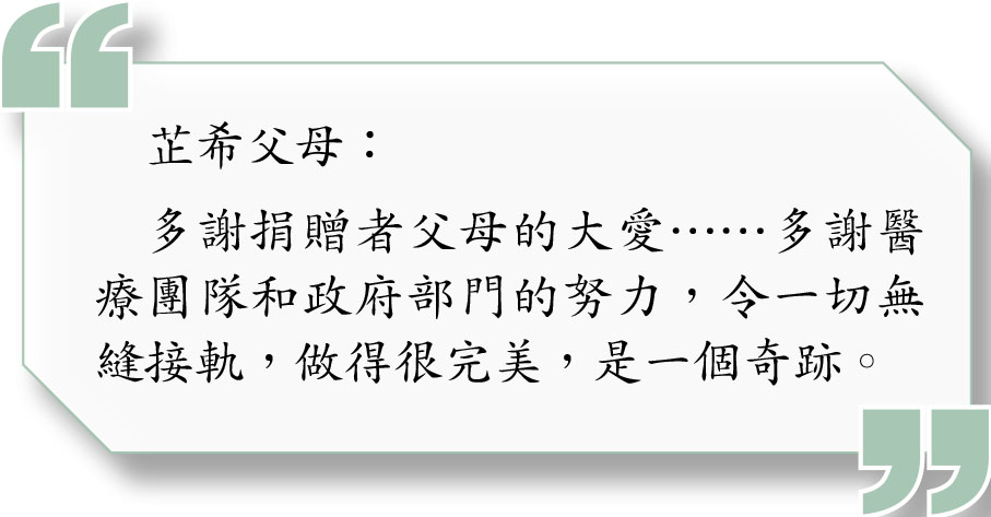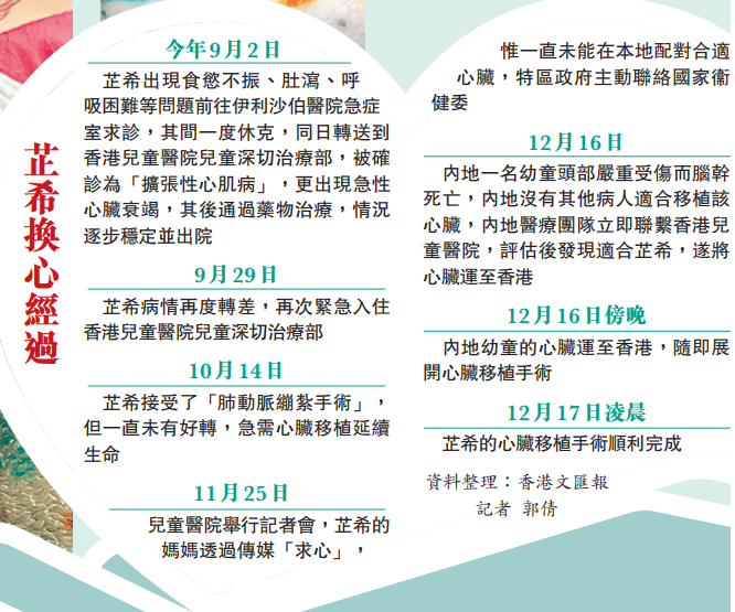 前日,內地一名幼童因意外頭部受重傷宣告腦幹死亡,其父母忍痛捐出兒子小小的心臟遺愛人間,惟內地沒有匹配的受捐贈者,內地醫療團隊不忍心臟浪費,隨即聯絡香港兒童醫院。一通電話重燃所有人的希望——該心臟適合芷希。