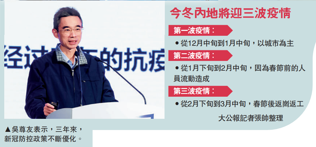 吳尊友判斷,今冬內地疫情可概括為「一峰三波」,從12月中旬到1月中旬將是第一波疫情,以城市為主,慢慢會上升起來;第二波是1月下旬到2月中旬,由於春節前的人員流動造成的第二波疫情上升;第三波是2月下旬到3月中旬,春節後返崗返工。這三波疫情將構成今冬的新冠流行峰,持續大概三個月。估計今冬疫情感染率在10%-30%。