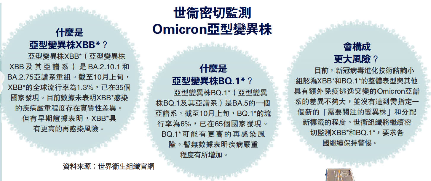 亞型變異株BQ.1*(亞型變異株BQ.1及其亞譜系)是BA.5的一個亞譜系。截至10月上旬,BQ.1*的流行率為6%,已在65個國家發現。BQ.1*可能有更高的再感染風險。暫無數據表明疾病嚴重程度有所增加。