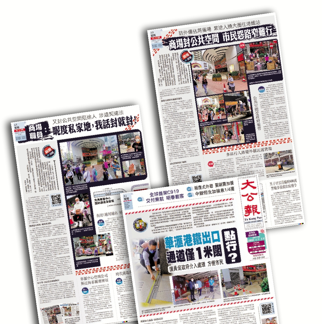 經連續多個周日到場了解,及以相關圍封照片向屋宇署及地政署發電郵查詢公眾通道範圍,兩個部門11月初起答覆含糊,在大公報記者鍥而不捨追問下,屋宇署於11月中回覆指出,華滙中心地下鄰近書局街入口前的空地屬私人土地的公眾空間,須開放予公眾使用,其後發展局和地政總署回覆交由屋宇署跟進。至於華滙派出清潔工不停扮洗地,擺放水喉及路牌在行人路,影響途人等問題,大公報記者附上圖片向食環署查詢,獲回覆職員未有發現貨物阻街或非法販賣活動,繼續視若不見。