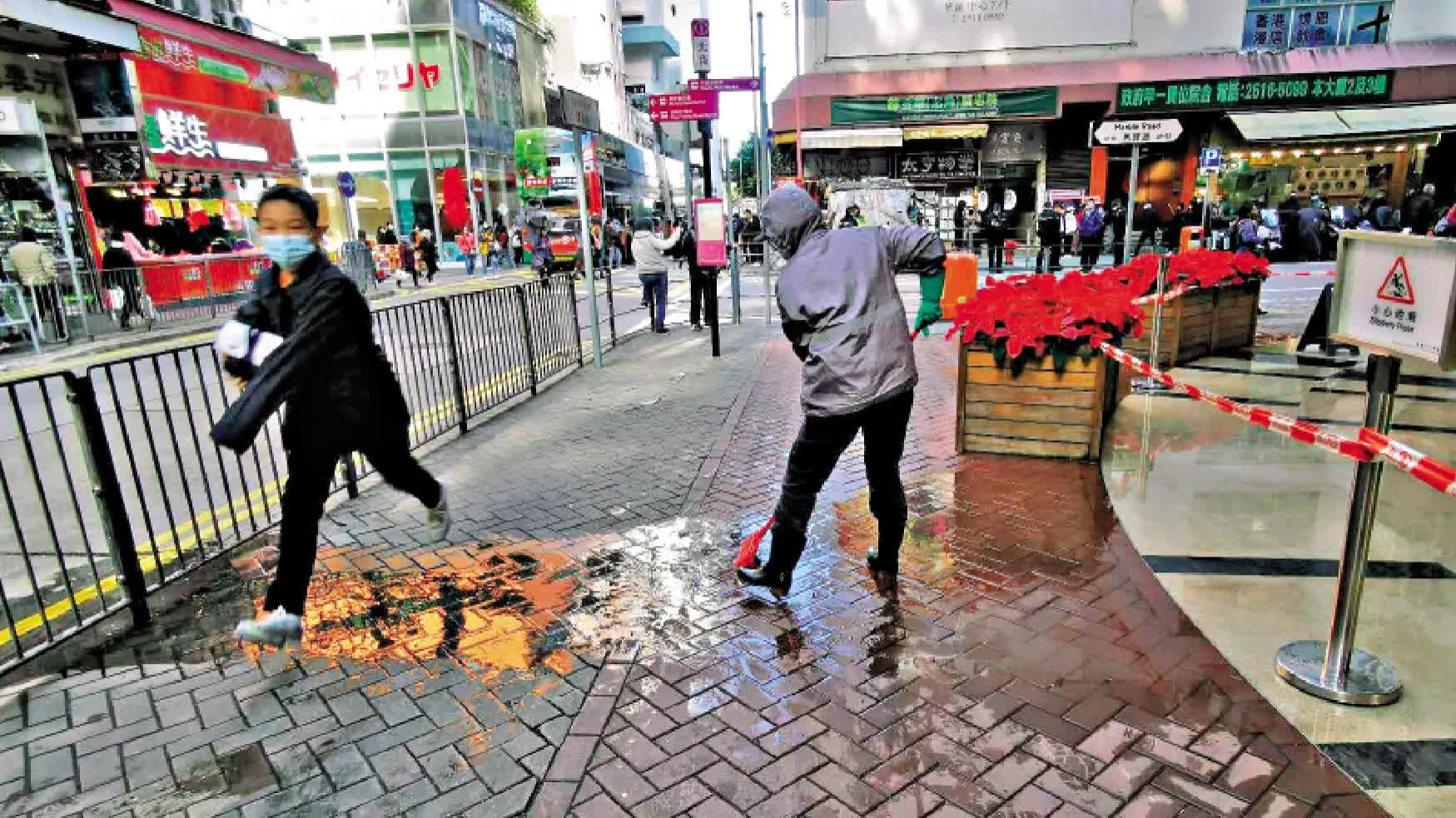 昨早近8時,北角馬寶道華滙中心管理處職員又再圍封與行人路相連的廣場,以及把港鐵站出入口收窄,並派出清潔工不停射水扮洗地,又把廣場積水掃至行人路,令公眾通道及行人路地面積水處處。凜冽寒風中,穿上厚衣的途人路過時本能地放慢腳步,避免滑倒。