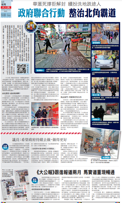 【大公報記者 施文達、盛德文、周揚(文)盛德文、吳子軒、調查組(圖)】持續擾民多月的華滙中心霸道圍封公眾空間風波,經《大公報》專題系列連續報道後,政府相關部門紛紛關注事件。昨日東區民政事務處、警方、食環署及勞工處四大部門展開聯合行動,在華滙中心周邊的馬寶道及書局街一帶處理阻街情況,獲市民讚賞:「條路暢順好多,政府做到嘢!」