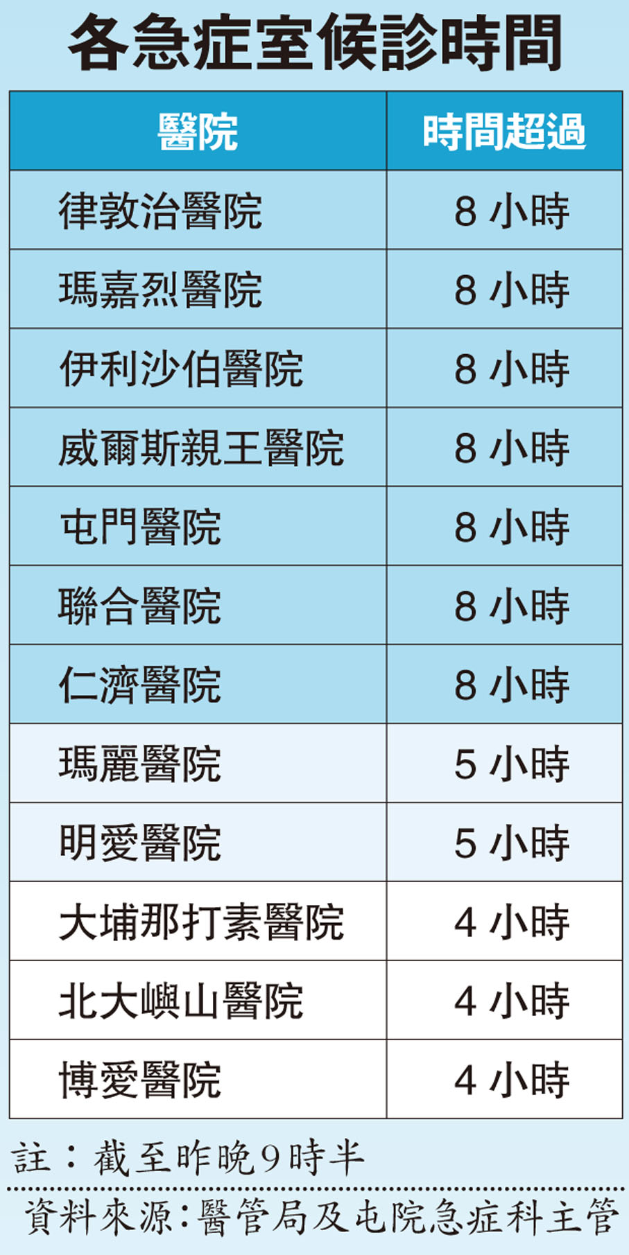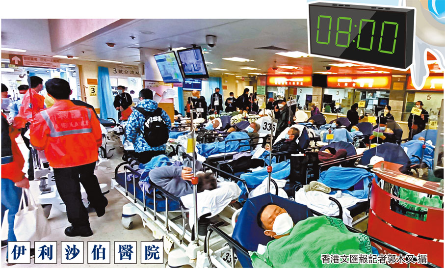 (香港文匯報記者 張弦、唐文)香港受到新冠疫情及冬季流感雙重夾擊,再加上近日天氣寒冷,求診人數急升,多間公院急症室昨日逼爆,伊利沙伯醫院、聯合醫院、仁濟醫院急症室的輪候時間超過8小時。香港文匯報記者昨日前往多間公院急症室採訪,發現處處爆場,部分求診者更排隊站至走廊甚至在廁所旁輪候診症,幾名員工則疲於奔命。有病人說:「私家醫院收費好貴,負擔不起,唯有排公院。」醫管局表示,求診者多因自身疾病或傷風、感冒求醫,同時低溫症求診的長者也增加,令急症室輪候時間延長,料情況會持續數天,呼籲一般傷風感冒等輕症病人轉向私營醫療求醫。